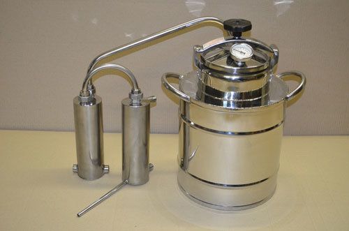 The housing can be made of metal or heat-resistant plastic. The only difference is durability - steel lasts longer. To protect the user from burns, manufacturers add a plastic handle to the distiller.