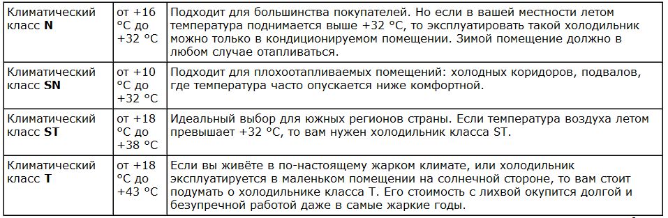 This is an indicator that specifies the temperature and humidity ranges in which it is recommended to use a particular model. For example, if one refrigerator is used in the Far North, and another in the southern regions (with their long summers), they should be of different climate classes. Because the first one works in severe frost conditions, and the second one works in constant heat and dry air.