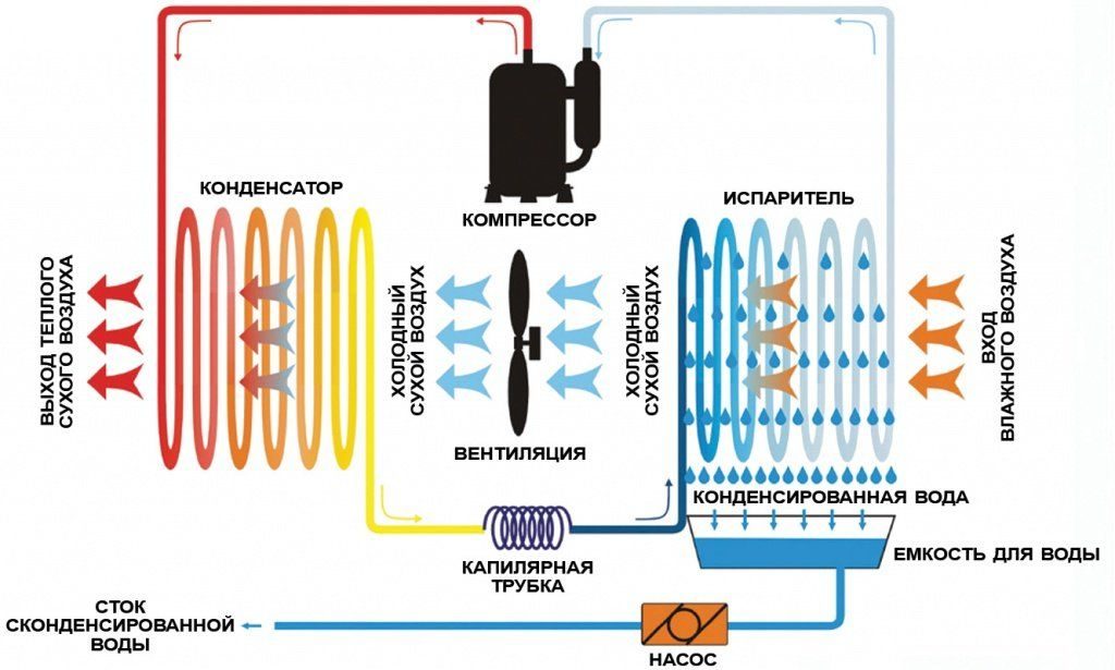 When choosing the model of dehumidifier to assemble, you should take into account that a condensing dehumidifier not only removes high humidity, but can also reduce the air temperature by about 5 degrees. Therefore, when using it, you should turn on the heater. The installation should be carried out in such a way that the air flows intersect.