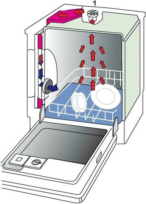 Condensation, or natural drying occurs when the dishes gradually cool down after rinsing them with hot water. The steam from the dishes condenses on the walls of the chamber, after which the drops flow into the container. The advantage is the cost-effectiveness of the method, the disadvantage is a very long drying time; some housewives, for example, start the machine in the evening so that the dishes are properly dry by the morning. An option to get rid of condensation on dishes is to open the dishwasher door.