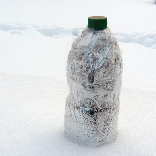 Let's say you only have a 0.5 liter bottle. Wrap it in foil. We put on two down socks or wrap them in a woolen scarf. We put on a black plastic bag and cover it with tape. The result will be a thermos from the “better than nothing” series.