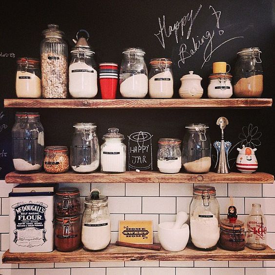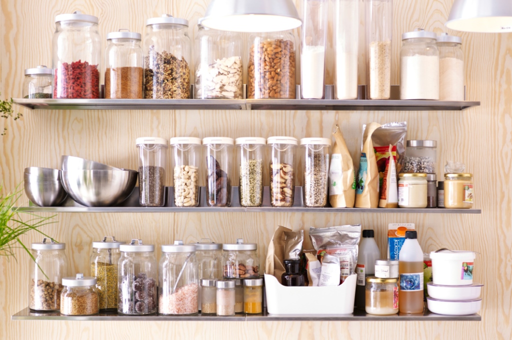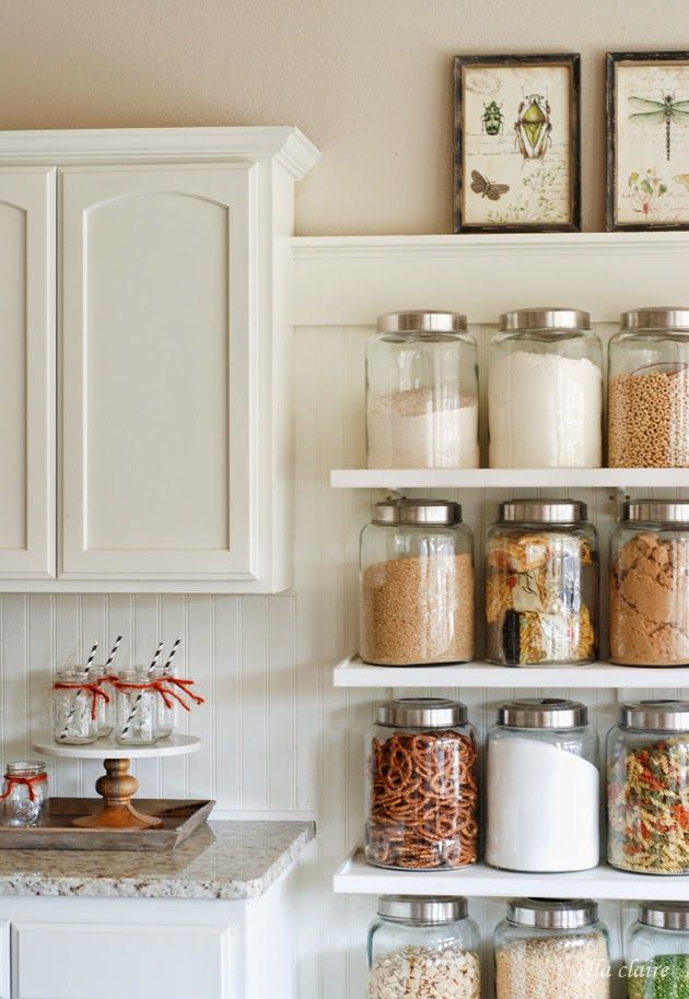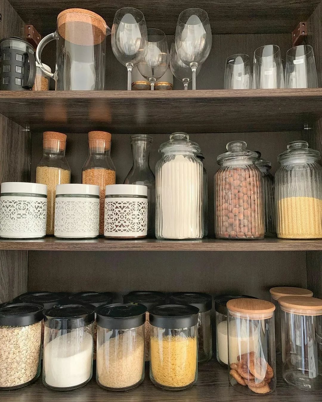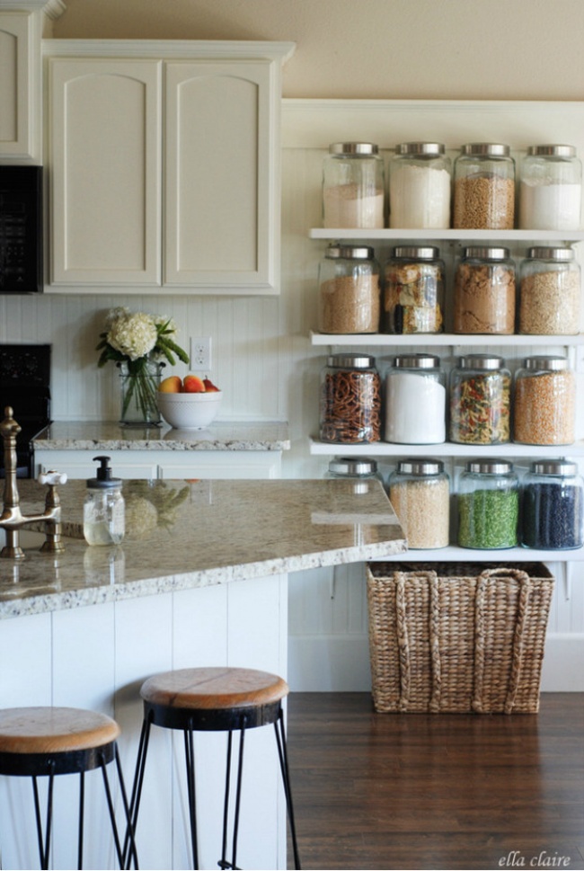This method is already known to everyone. We pour cereals or tea/coffee into glass or plastic jars and arrange them beautifully on an open shelf. The advantage is that food is stored in a closed container much longer, and the risk of bugs infesting it is rapidly decreasing. By the way, the transparent storage container makes it easier to find the right product, and everything looks pretty nice.