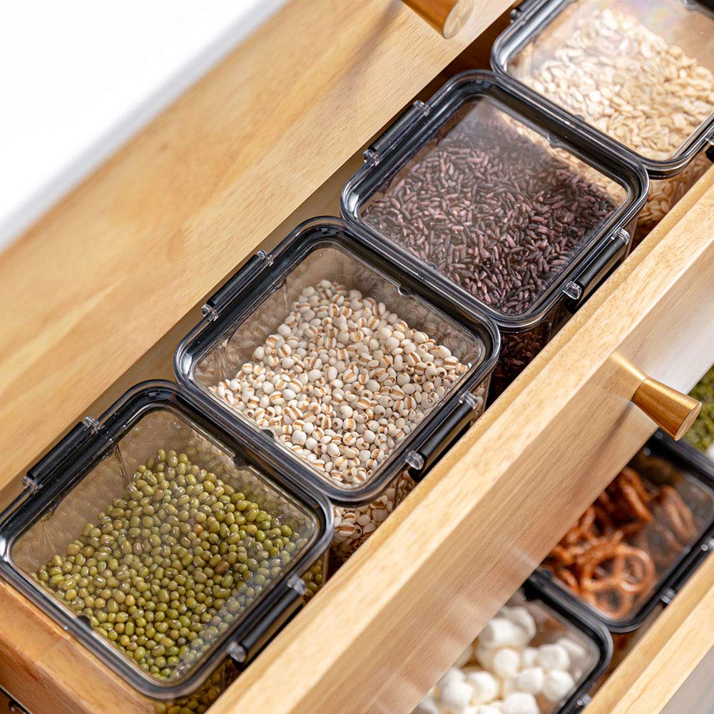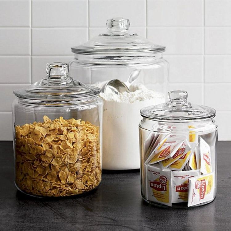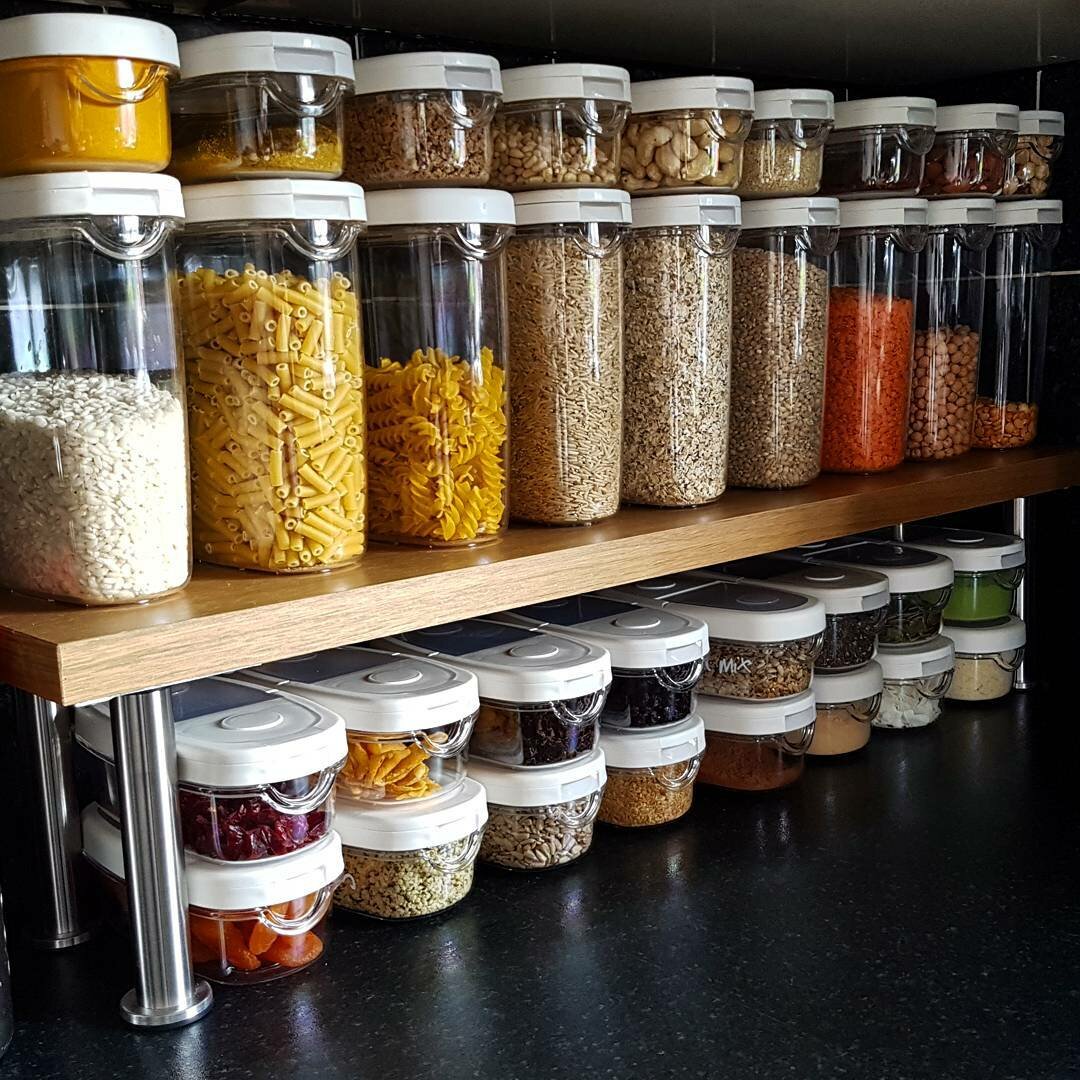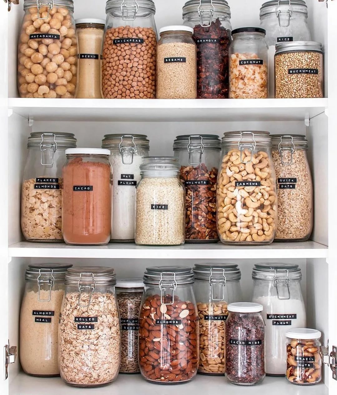 This method is already known to everyone. We pour cereals or tea/coffee into glass or plastic jars and arrange them beautifully on an open shelf. The advantage is that food is stored in a closed container much longer, and the risk of bugs infesting it is rapidly decreasing. By the way, the transparent storage container makes it easier to find the right product, and everything looks pretty nice.