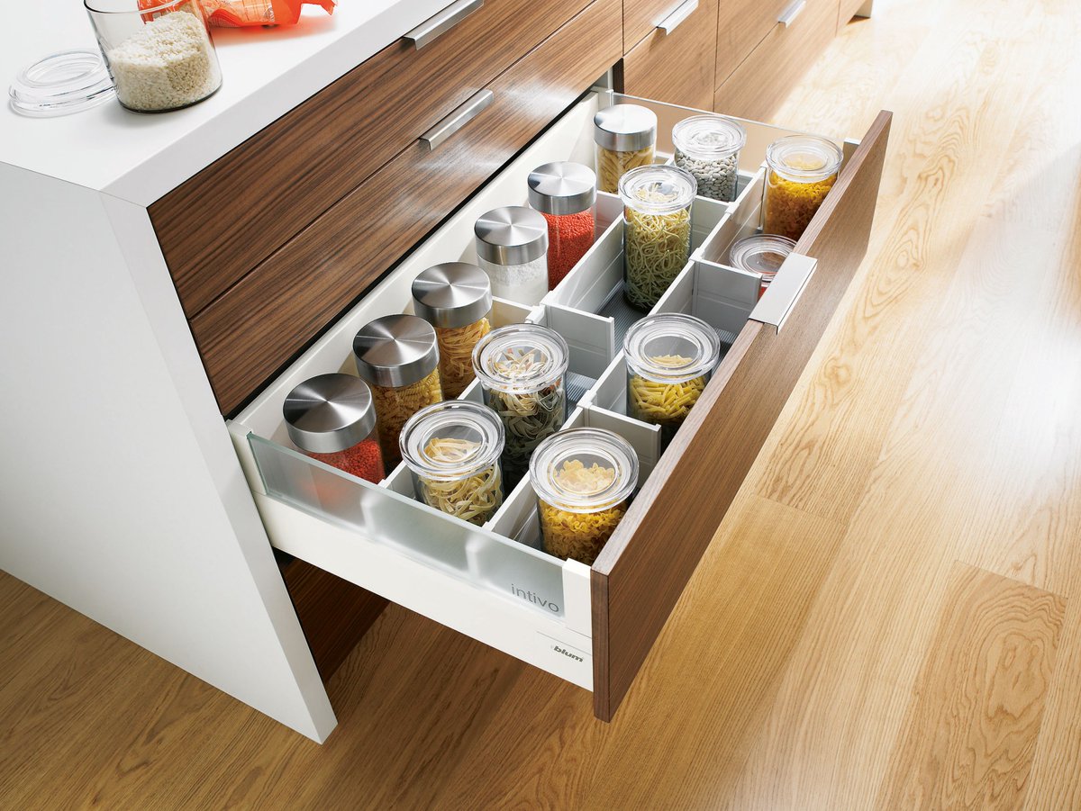 If you don’t have a shelf (or you’re not used to storing food openly), then a drawer will do. But it’s better to pour cereals and other bulk products into plastic containers and label the lids. This will make it easier to immediately find the right jar.