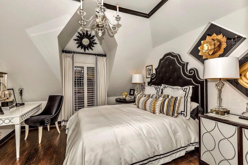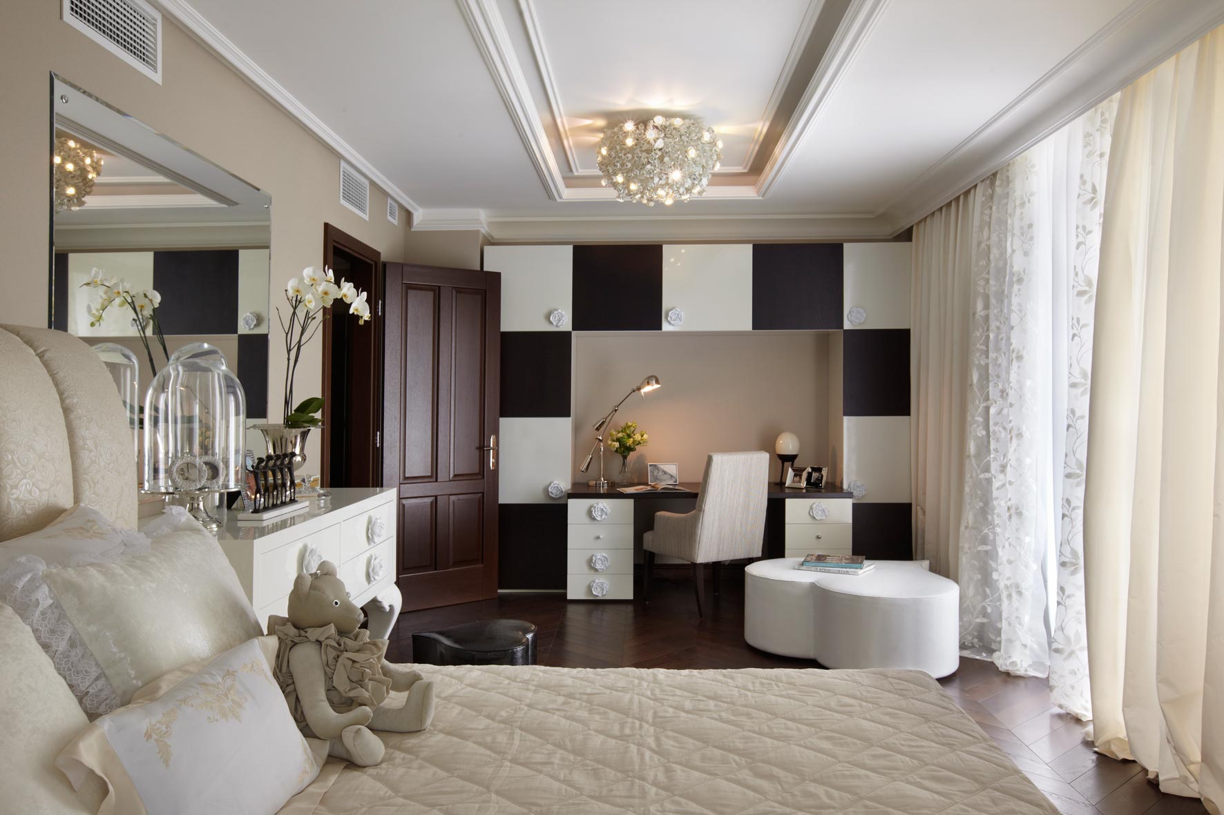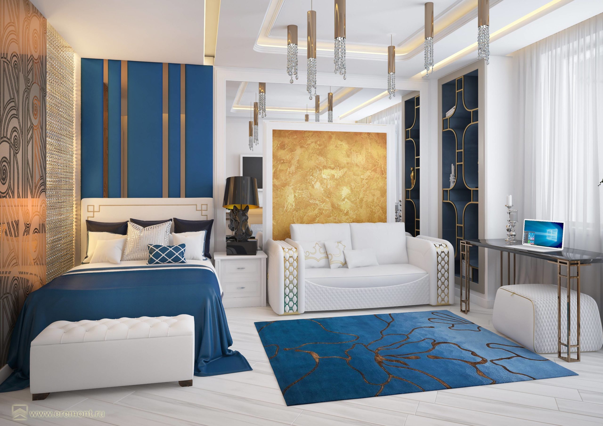 The main shades are calm, combined with contrasts and gilding.The room is decorated in a neutral but strict palette. The most popular are black and white. Gold, bronze, and steel are used as accents.