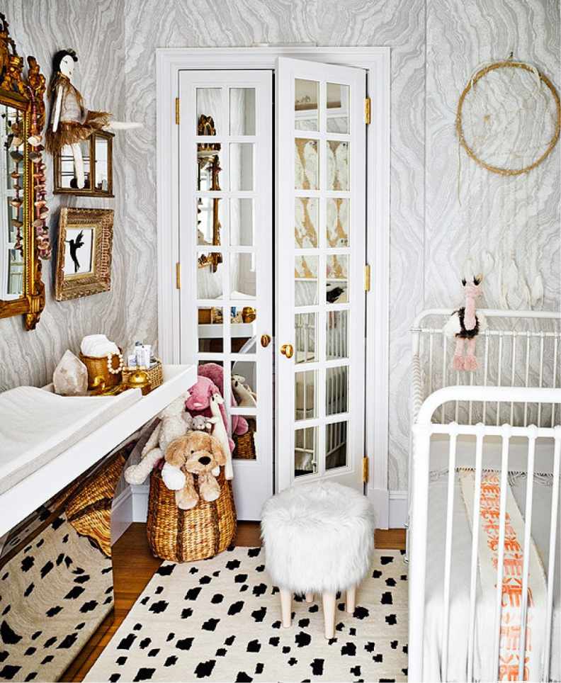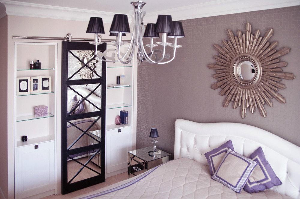 Mirrors are the element that generally forms this direction. Products with unusual shapes or in laconic frames made of nickel or chrome will look impressive. It is permissible to place intricate details in the form of large feathers, flower buds and other plant and animal motifs. Accent components of art deco in the nursery are the sun and a semicircle.