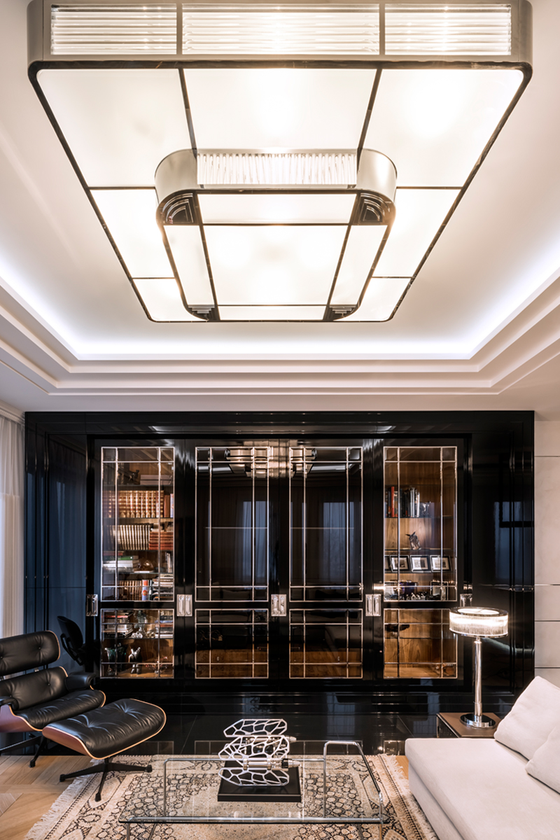 The interior impresses with its categorical absence of smooth lines and abundance of sharp corners, as well as clear contrast, complexly alternating with abstraction and symmetry.