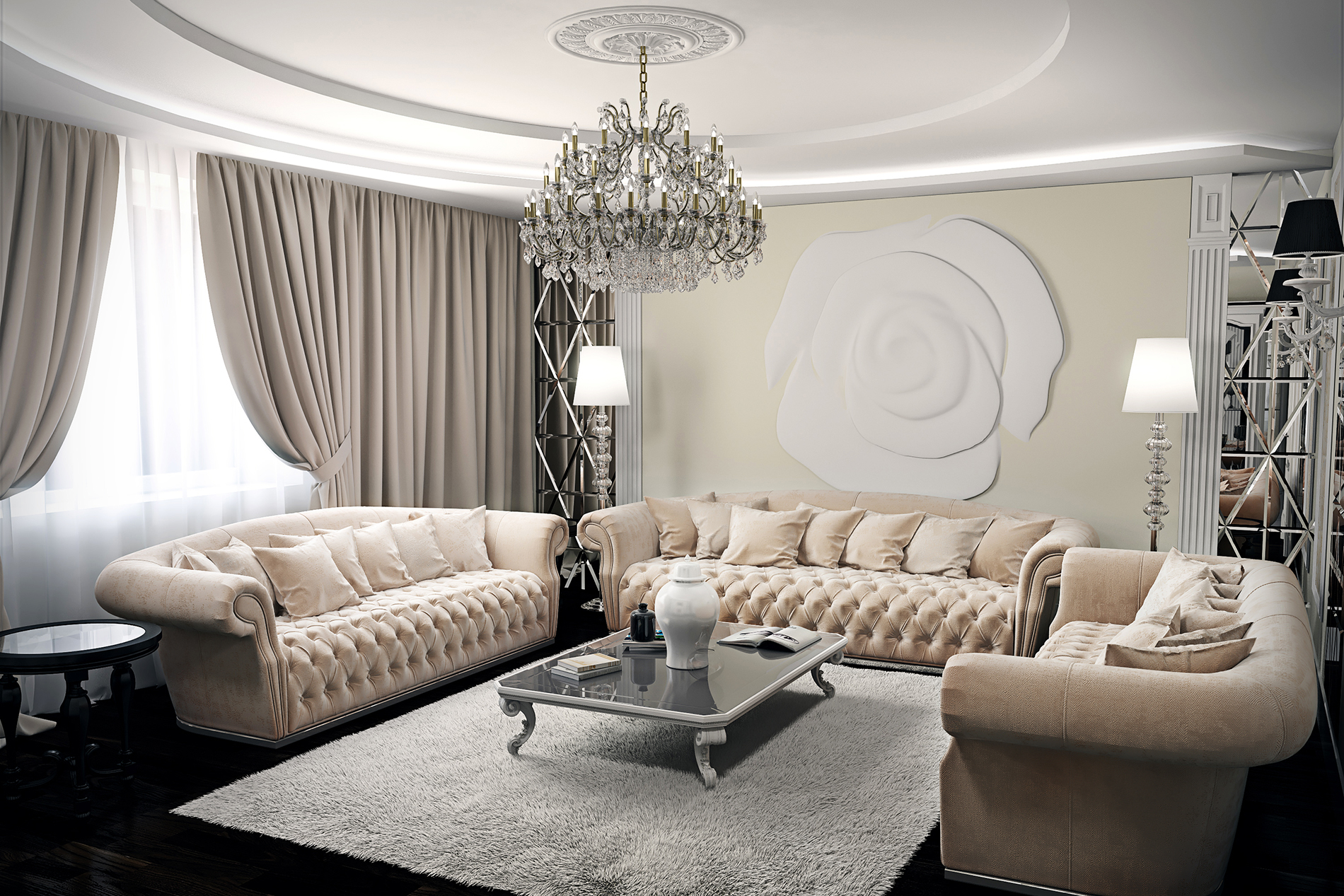 It can be decorated with stucco or special niches can be made in it, which do not necessarily have to have the correct shape. A rounded recess in the middle from which a cascading chandelier will hang is also ideal.