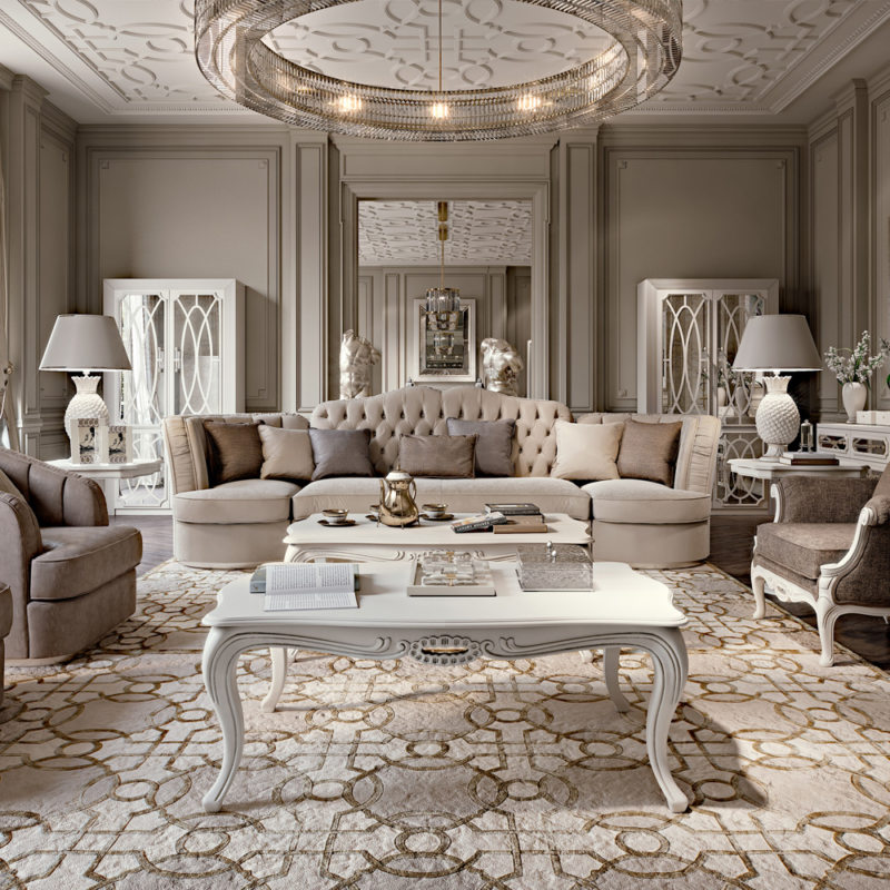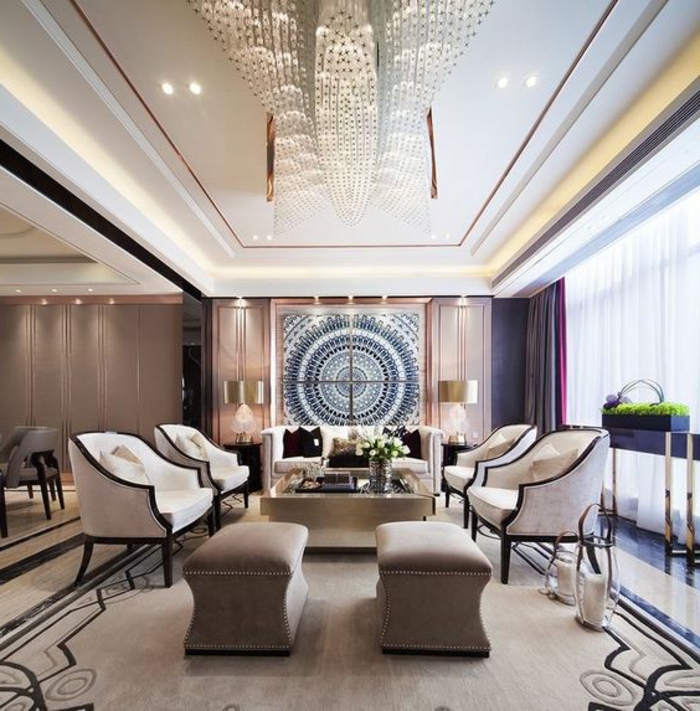 When arranging a room, do not arrange furniture as usual - along the walls. Art Deco prefers beautifully decorated areas. They need to be separated. More precisely, the arrangement should begin from the center of the living room. First, a coffee table is placed, and then compositions of armchairs and a sofa are built around it.