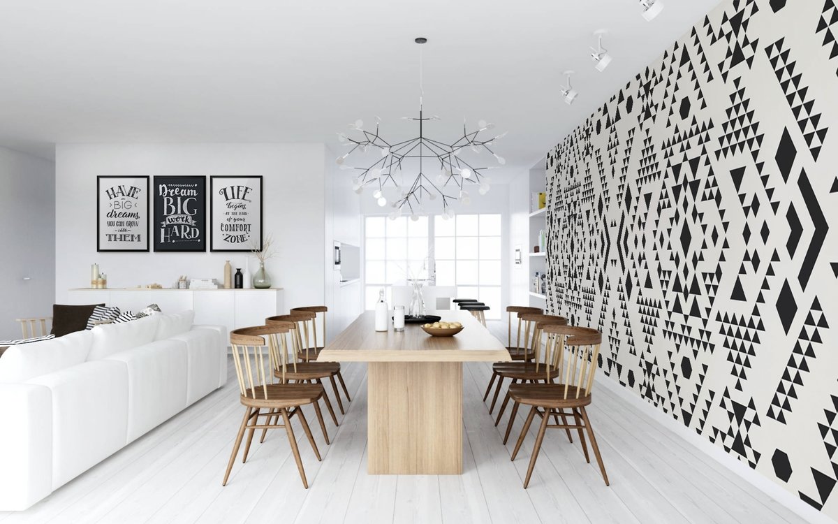 The wallpaper contains modern and ethnic pictures and prints that stylishly complement the surrounding environment. Often used simple geometric patterns. They fit colorfully into the interior, especially if they match the colors with the furniture in the room.