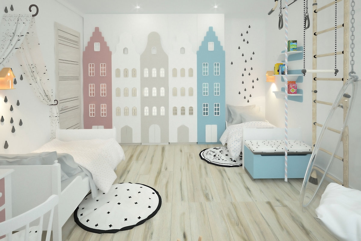 A children's room is a special world of toys, funny quests and imaginary characters. Even in Scandinavian style, this room looks a little brighter than other rooms in the house. Canvases with small ornaments are suitable here. Drawings are chosen on the theme of fairy tales and magical stories, preferably borrowed from books of northern countries.