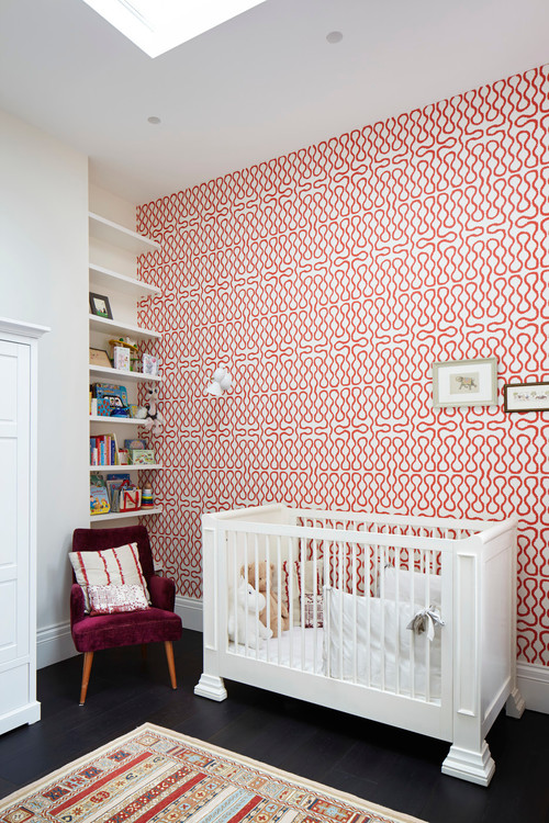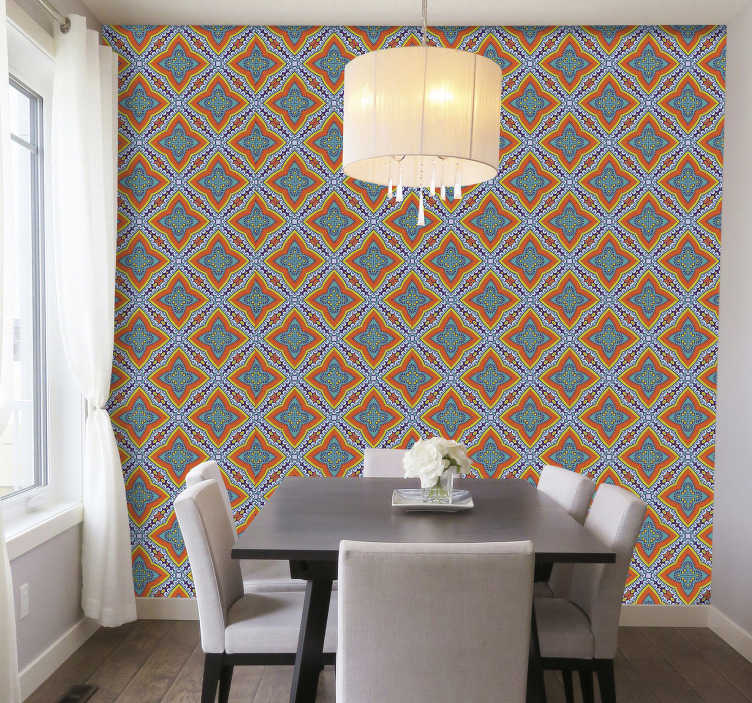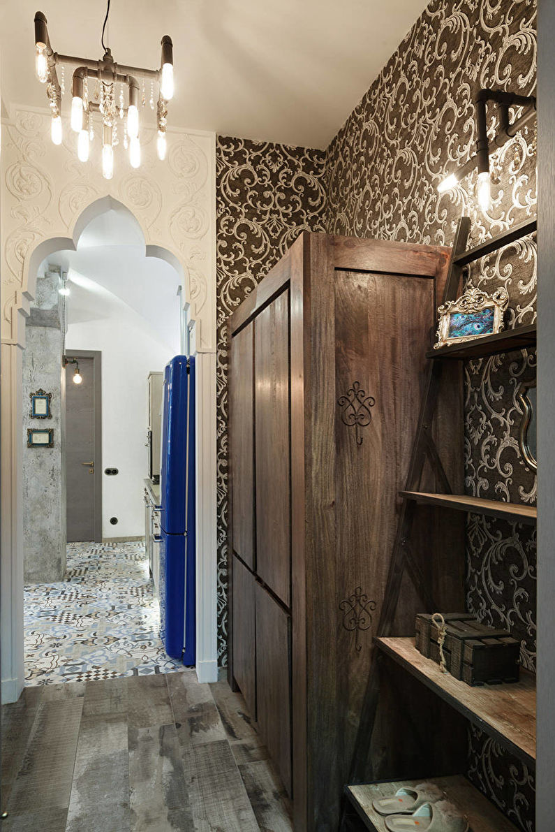 Wallpaper with bright floral elements or some kind of vertical pattern characteristic of the style will fit perfectly here. You can combine turquoise, crimson, reddish shades - this finish fills the entire room with warmth.