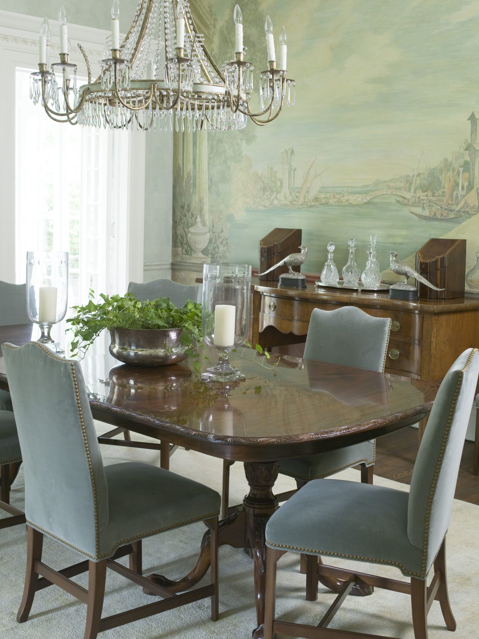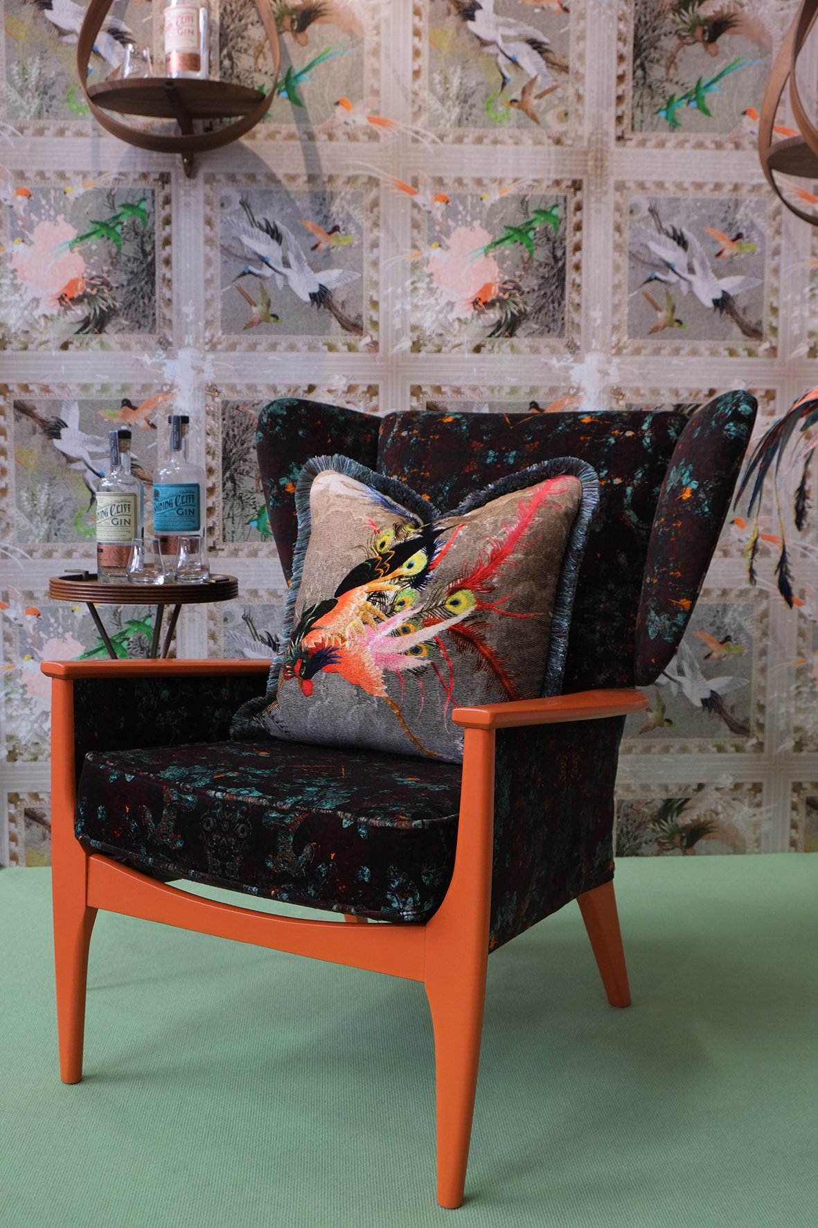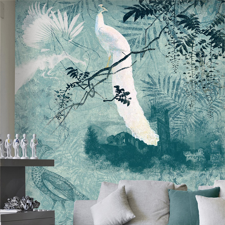 - images of flying birds, mythical animals, trees in bloom: