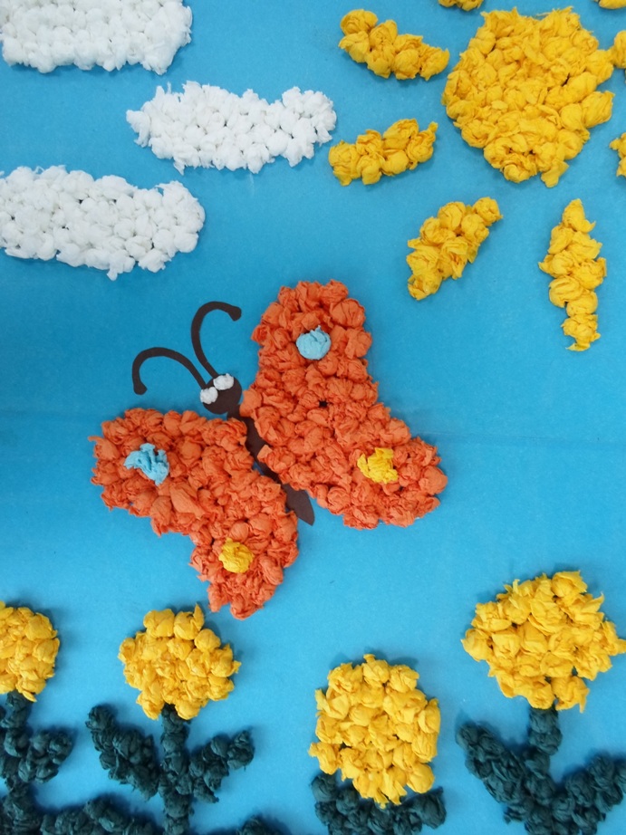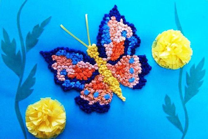 For example, you want to create a butterfly with your baby. To do this, you need to draw it on cardboard, highlighting all the details.Then take a napkin of a certain color, tear off a small piece from it, roll it into a ball and glue it to the base in the area that needs to be filled with a specific color. And this is how every detail of the butterfly is worked out.
