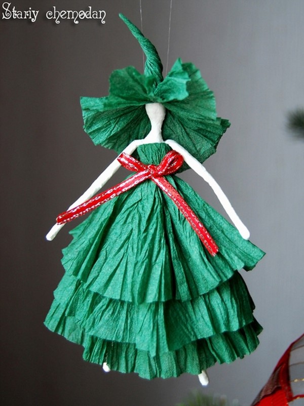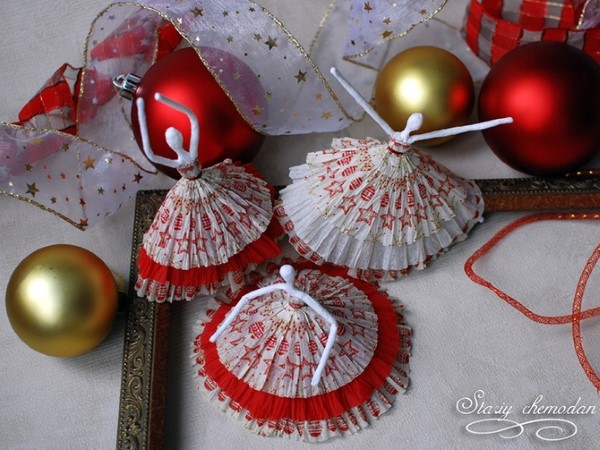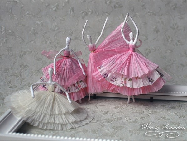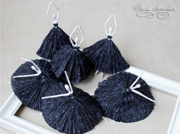 All that remains is to make a hole in the center for the head and arms and push the ballerina through. The skirt needs to be pulled tightly with thread or ribbon so that it does not fly off.