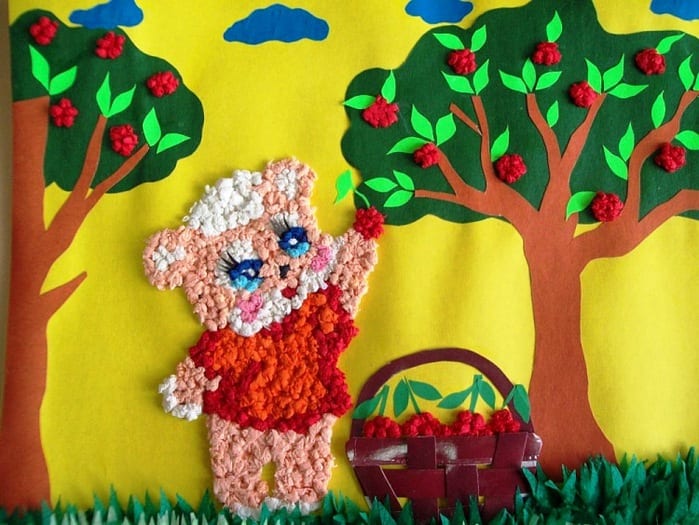 You can use anything as an idea: animals, insects, birds, plants, a house, flowers and much more. To begin with, it is better to think over an easy scheme so that the baby understands how to act. With experience, the complexity can be increased and more complex options can be offered for implementation, requiring accuracy and the use of several shades of napkins.