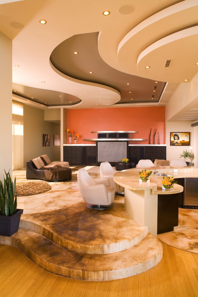 It is customary to gather in the living room with the whole family or relax alone. Here they meet with friends, hold parties or sit in front of the TV. The room is intended for relaxation after everyday work and relaxation. The design allows for the use of multi-level ceilings with complex lighting and zoning. But an ordinary flat ceiling made of gypsum plasterboard sheets painted with monochrome paint will also look good.