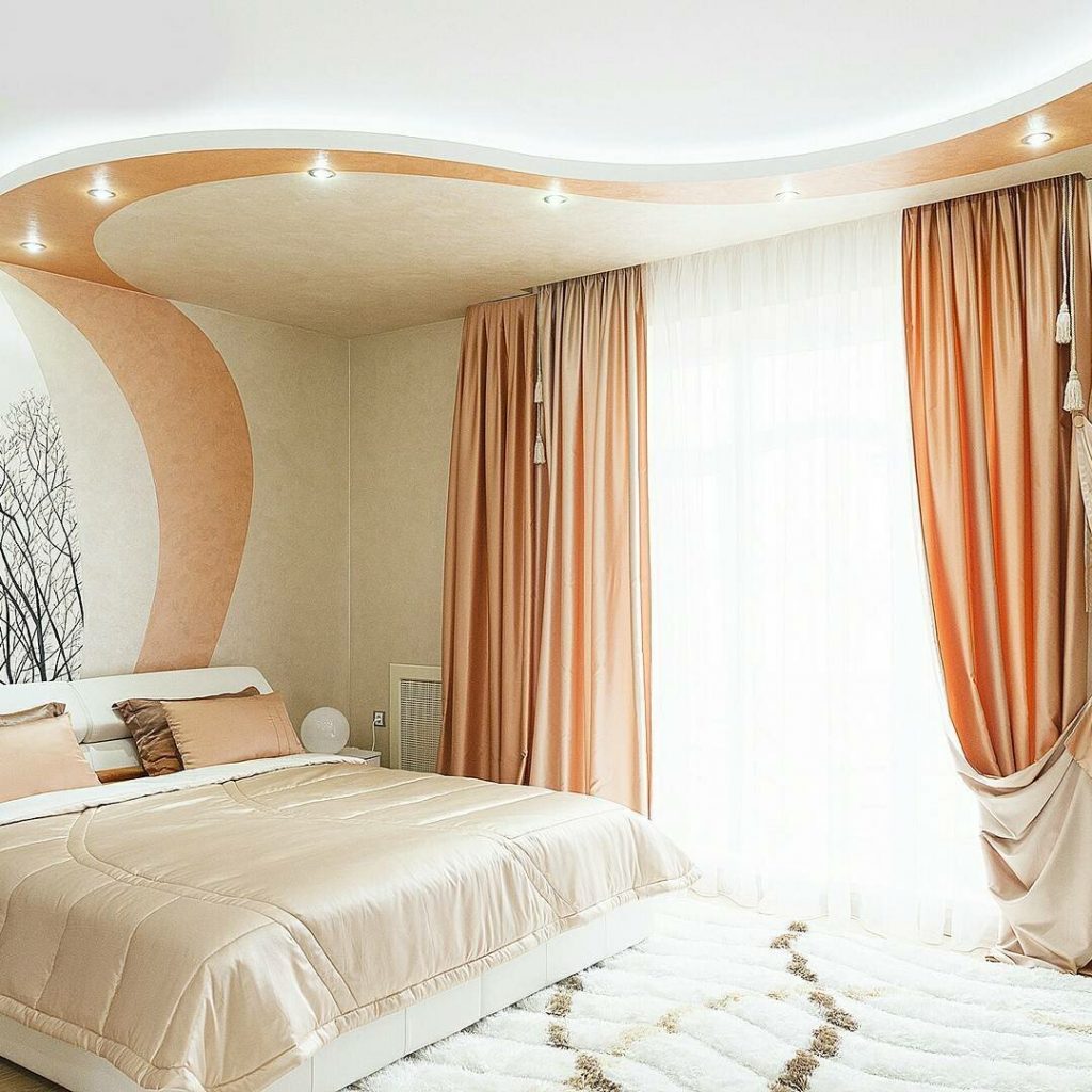 It is not recommended to create multi-level ceilings for the bedroom. It is better to build a flat surface and cover it with paint in pastel colors. This promotes peace and restful sleep. Two-level designs with an imitation of a starry sky in the center of the room or thematic designs are allowed. They put you in a positive mood and promote a good mood.