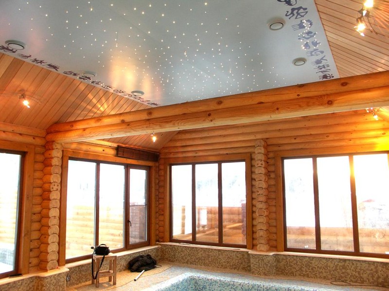 This material combines the properties of rolled wallpaper and decorative plaster, which can also easily be used to cover the ceiling in a wooden house. The dry composition is soaked before application, and then a monochromatic coating or unusual patterns are created on the surface. Using liquid wallpaper easy to hide the imperfections of the ceiling - decorate the ceiling in whole or in part, and carry out zoning.