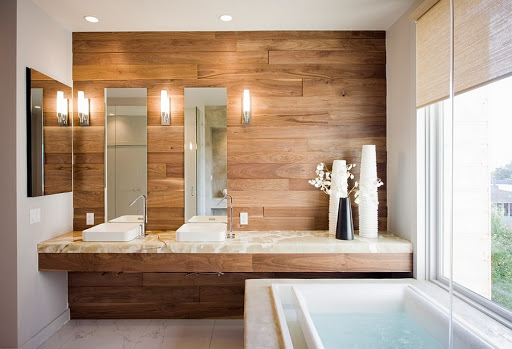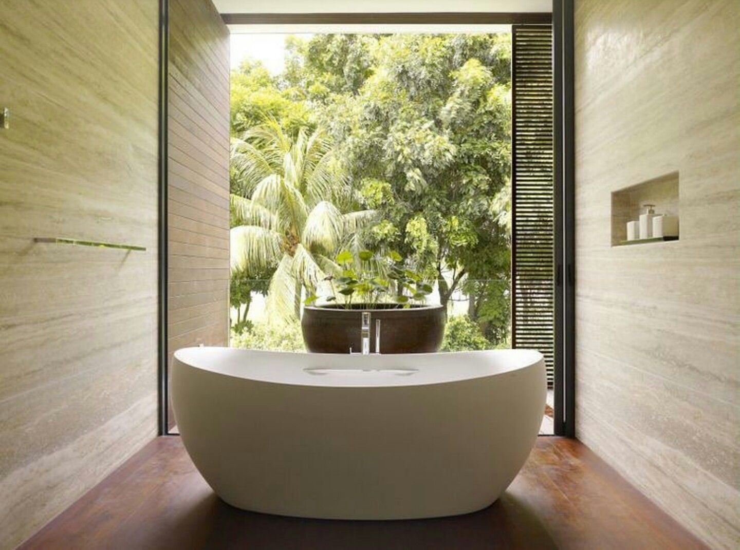 If the renovation is not going to be cheap, consider installing a bathtub made of natural stone or wood. For a budget option Suitable for installing a round white sink on a thick wooden tabletop. The bathtub is installed in a simple, original shape.