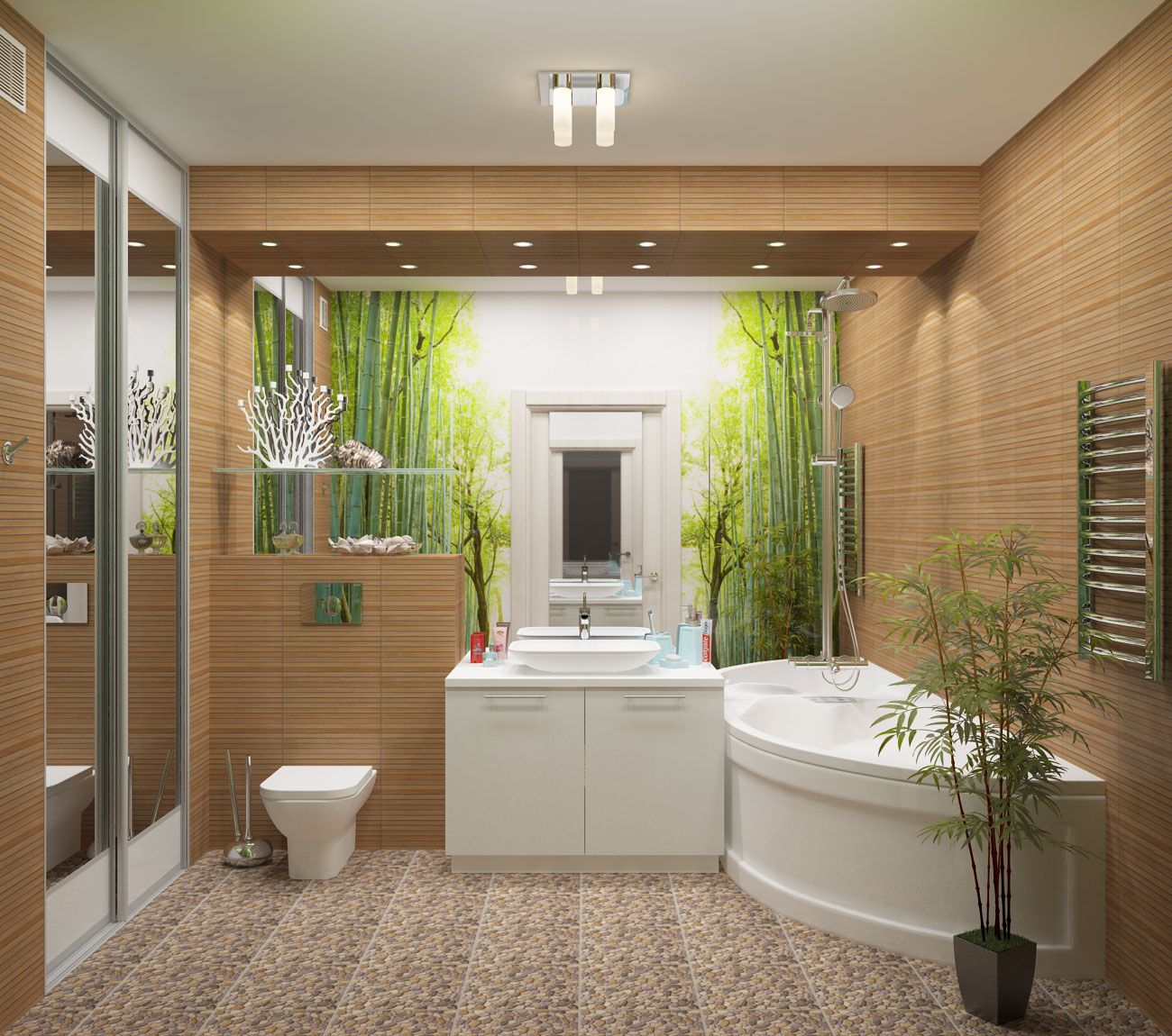 Important point - All materials must meet the principles of environmental friendliness. The main task of eco-style is to create a comfortable microclimate in the bathroom space. A person should feel unity with nature, breathe deeply.