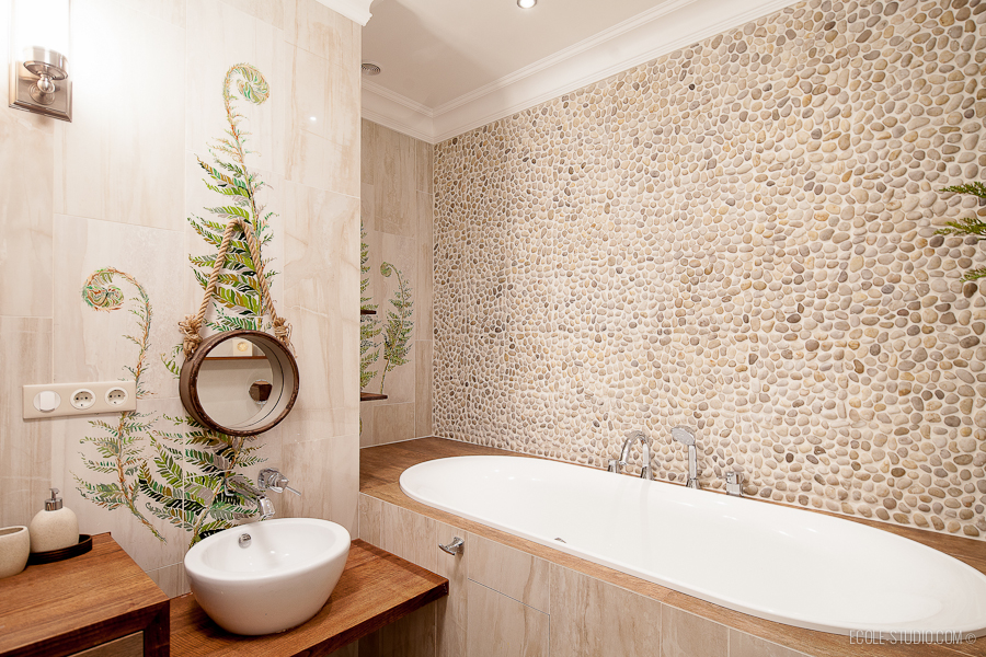 I note that creating such a design will not require large expenses or complex technical solutions. The bathroom will be transformed, but at the same time remain environmentally friendly and conducive to long rest and relaxation.