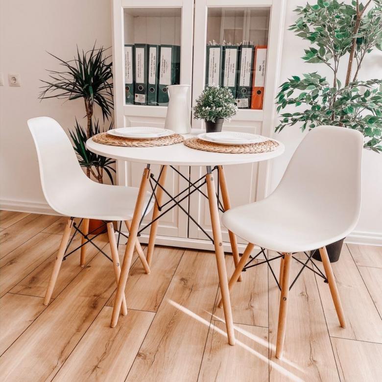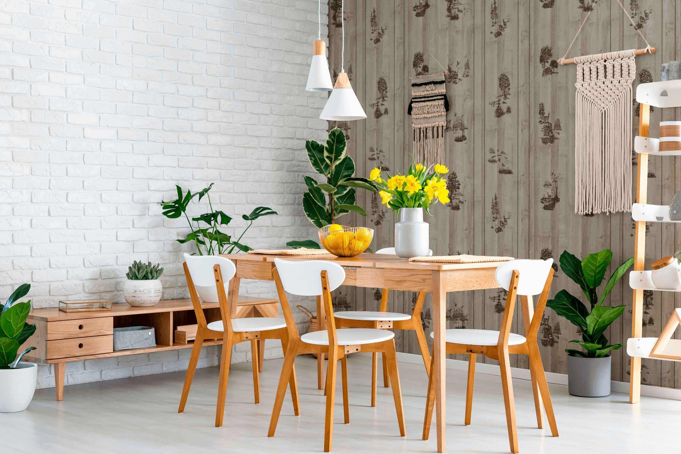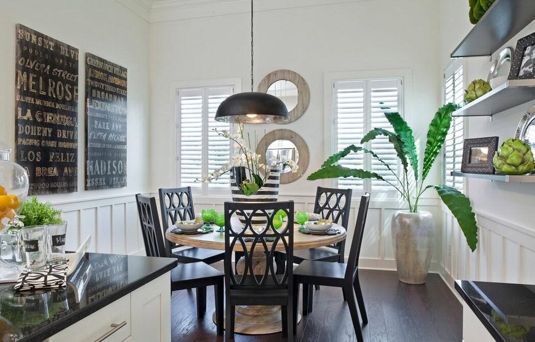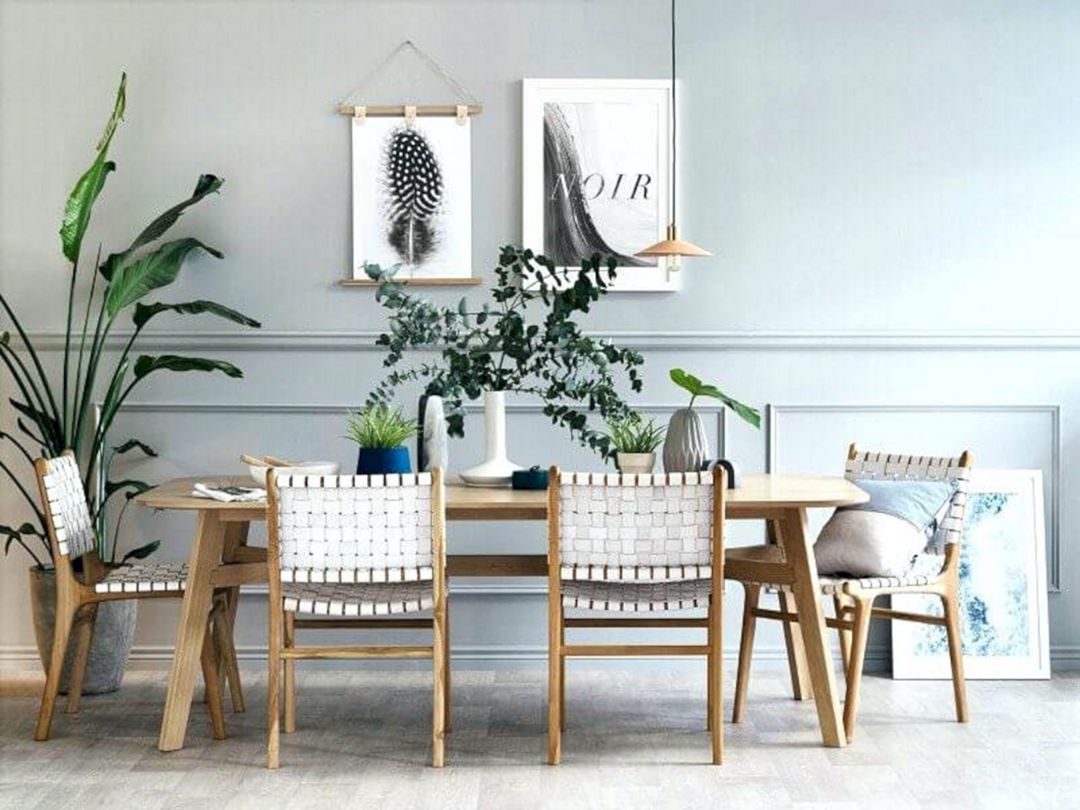 For lovers of eco-style, there is an excellent solution - to surround the table with plants. There are many options - you can put tall bushes like calathea or ficus on the floor or place small pots with hanging plants on hanging shelves.