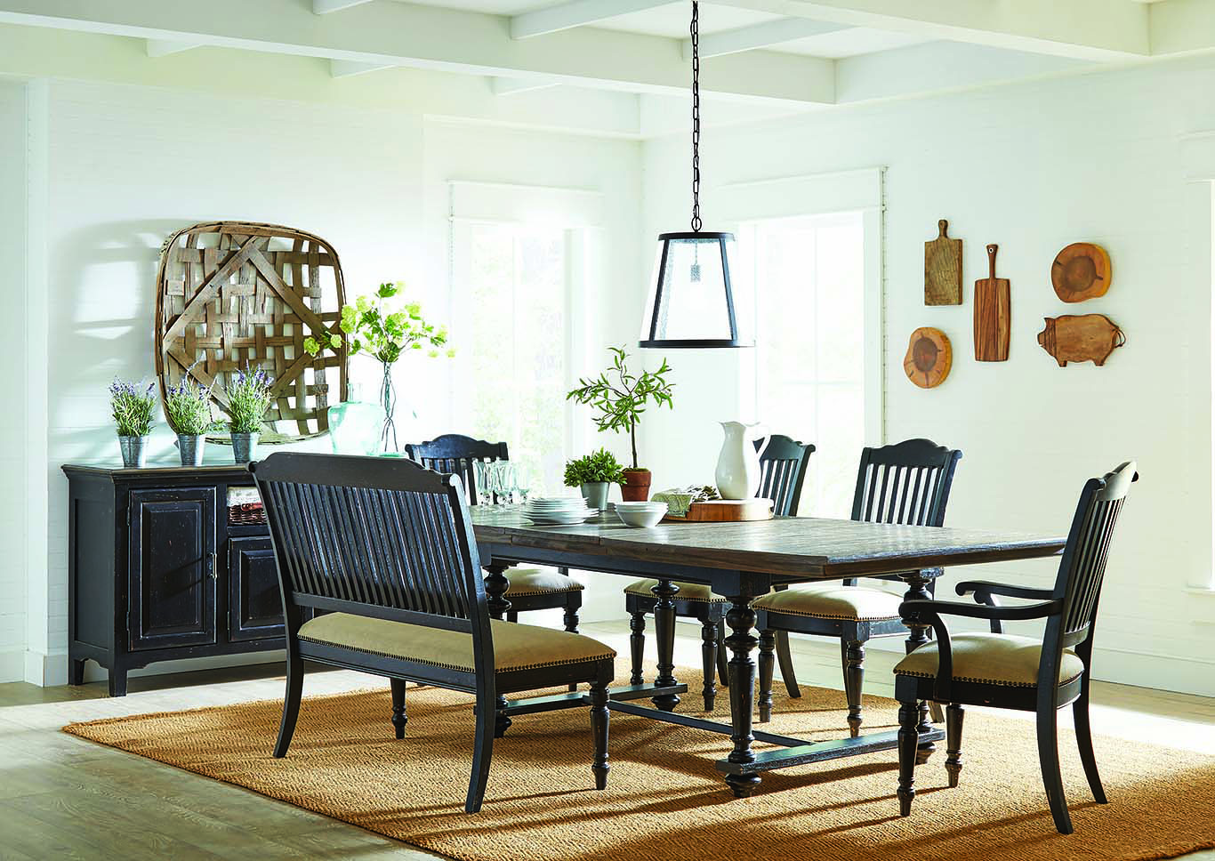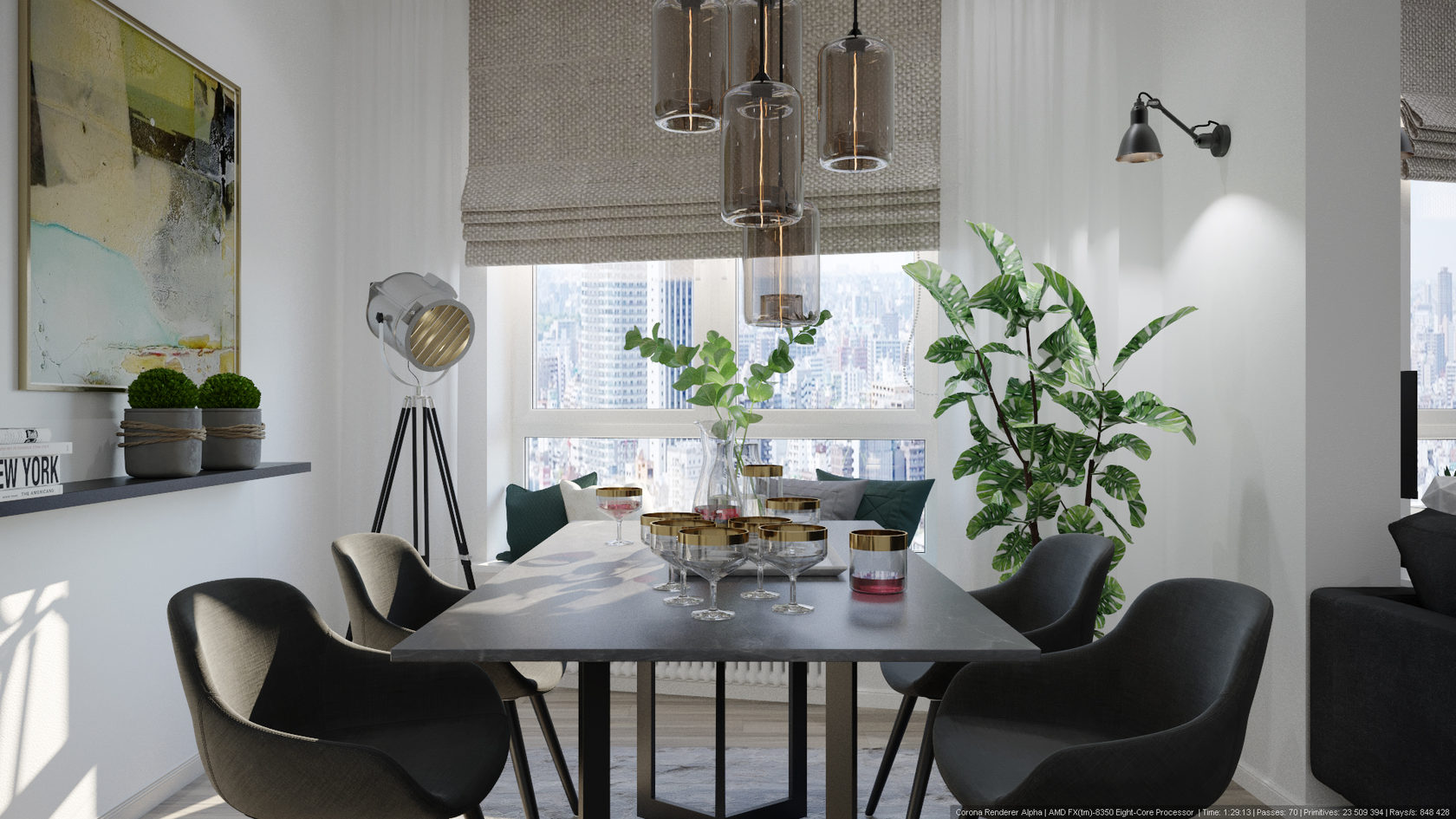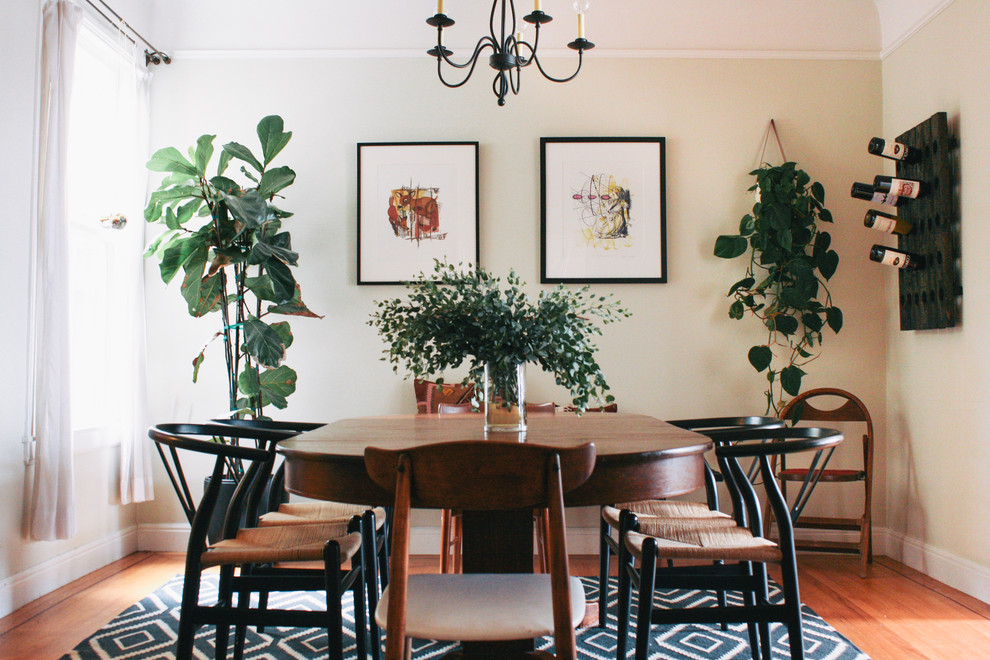 For lovers of eco-style, there is an excellent solution - to surround the table with plants. There are many options - you can put tall bushes like calathea or ficus on the floor or place small pots with hanging plants on hanging shelves.