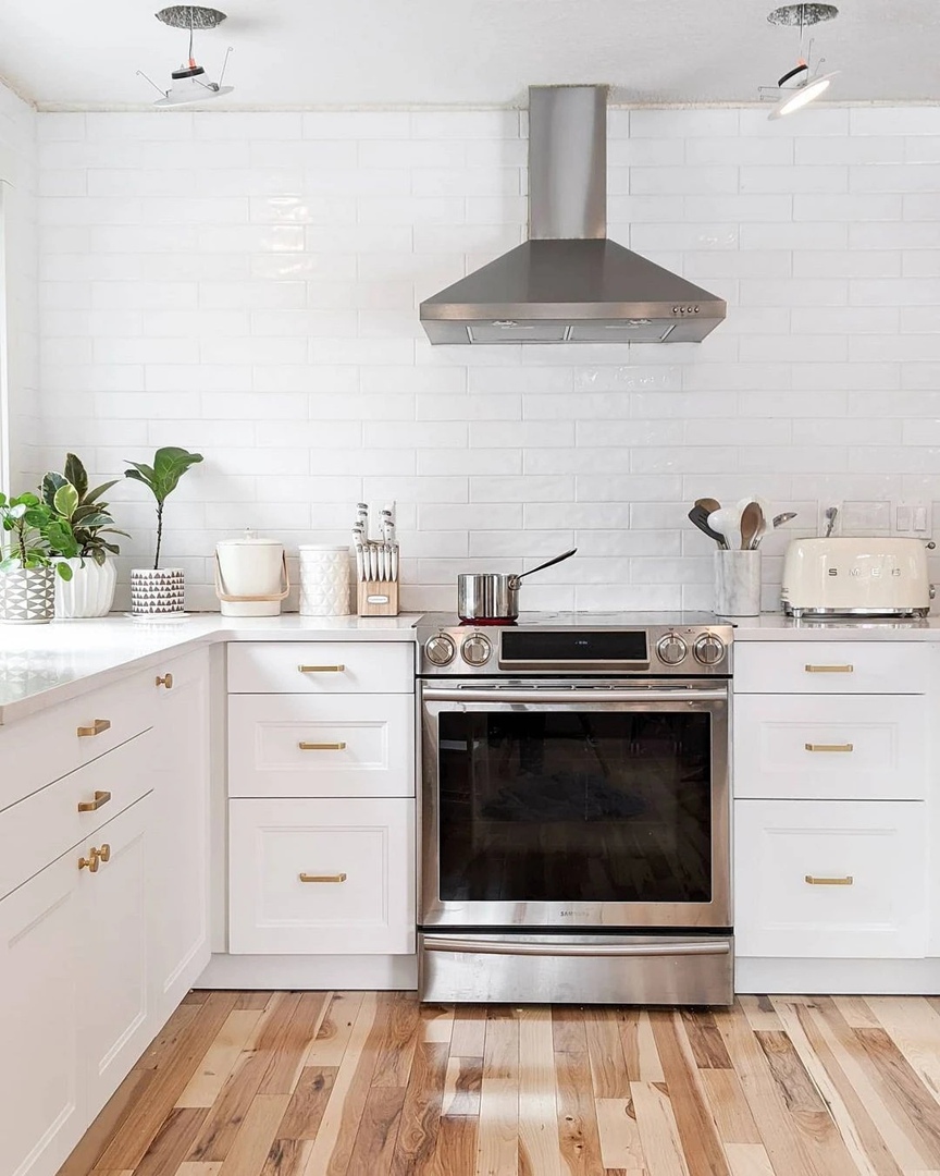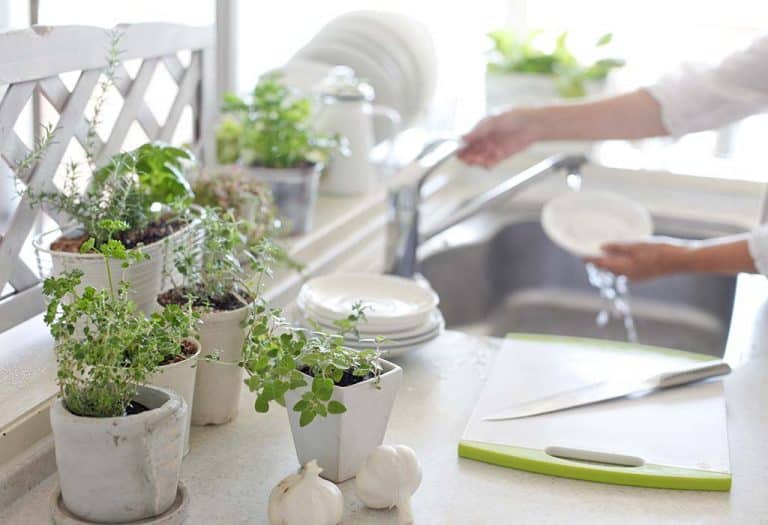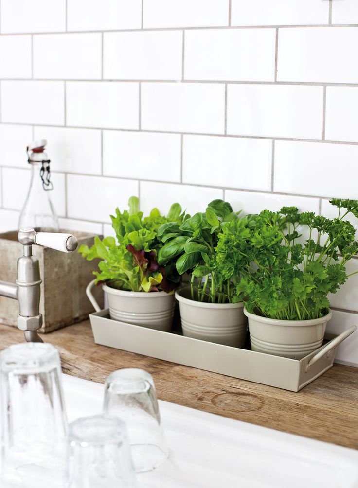 Try to decorate the work area in the kitchen not with accessories and unusual appliances, but with greenery - indoor flowers. They can be placed in pots on the countertop or you can find a place for them on open shelves. By the way, those plants that can be used for your culinary recipes will fit perfectly into the room: basil, bay, rosemary, mint or lavender, and even green onions - they will come in handy.