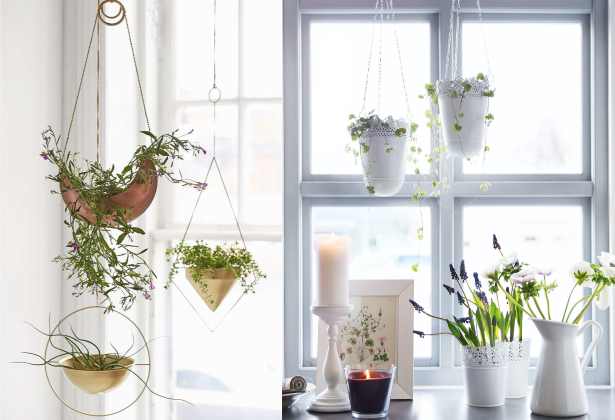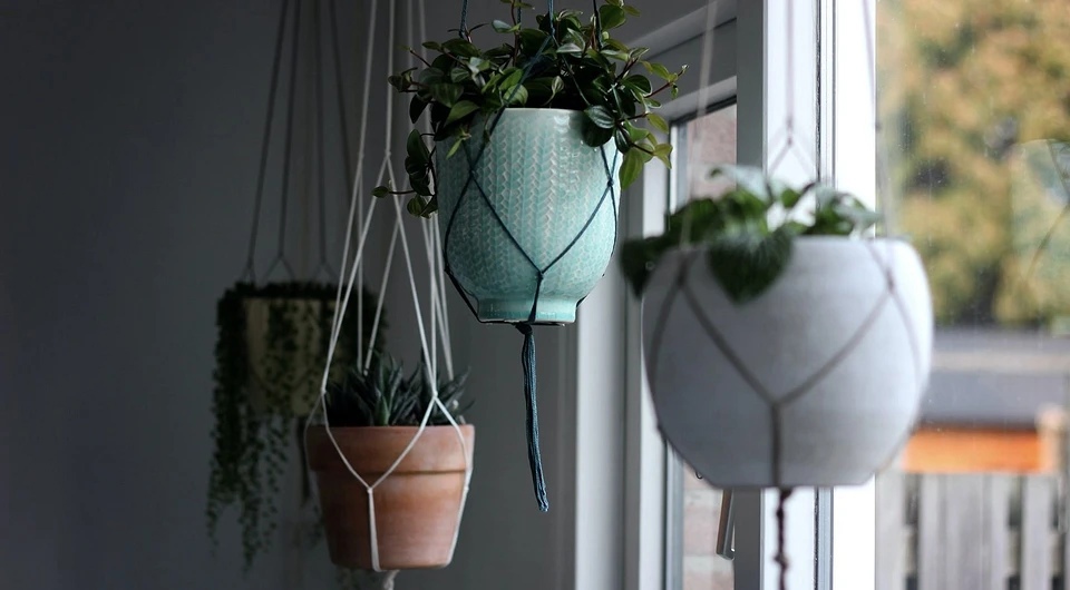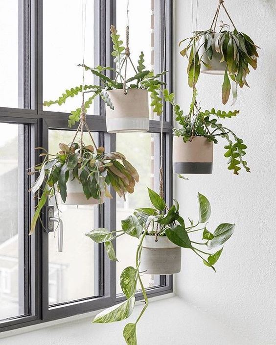 If, out of habit, it is difficult to remove pots from the windowsill, then you can only slightly shift their “geolocation”. An excellent solution is to create a kind of garland of plants and hang the composition in front of the window, securing the flowerpot to the ceiling. In addition, this option is ideal for those who do not like window decor: curtains, massive curtains, tulle and curtains.