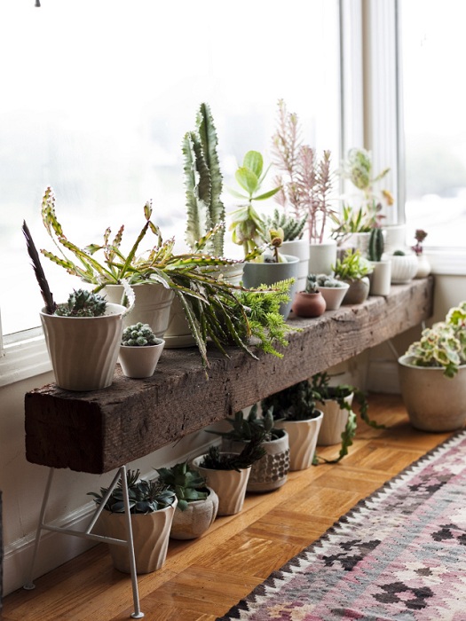 By the way, for some reason we don’t like to put small pots down, but this option can be played out beautifully by making a compact wooden podium with your own hands with different levels and placing your favorites on them. It will turn out very interesting and creative.