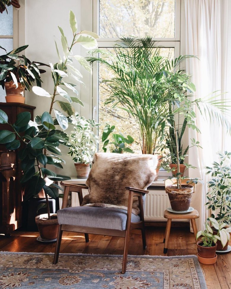 If you have a “lonely” chair at home, then add plants to it and get a great place for relaxation and tranquility. You just need to choose a few large flowers and place them around the furniture, creating a secluded corner.And if you add different levels, then such a composition will look very beautiful and original.