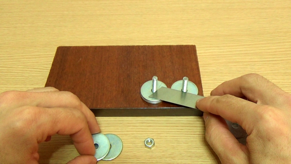 Drill two holes for screws in a piece of plywood. Their diameter is 8 mm, the distance from each other is about 2 cm. Next, screws are inserted into the prepared holes, and washers are placed on them.