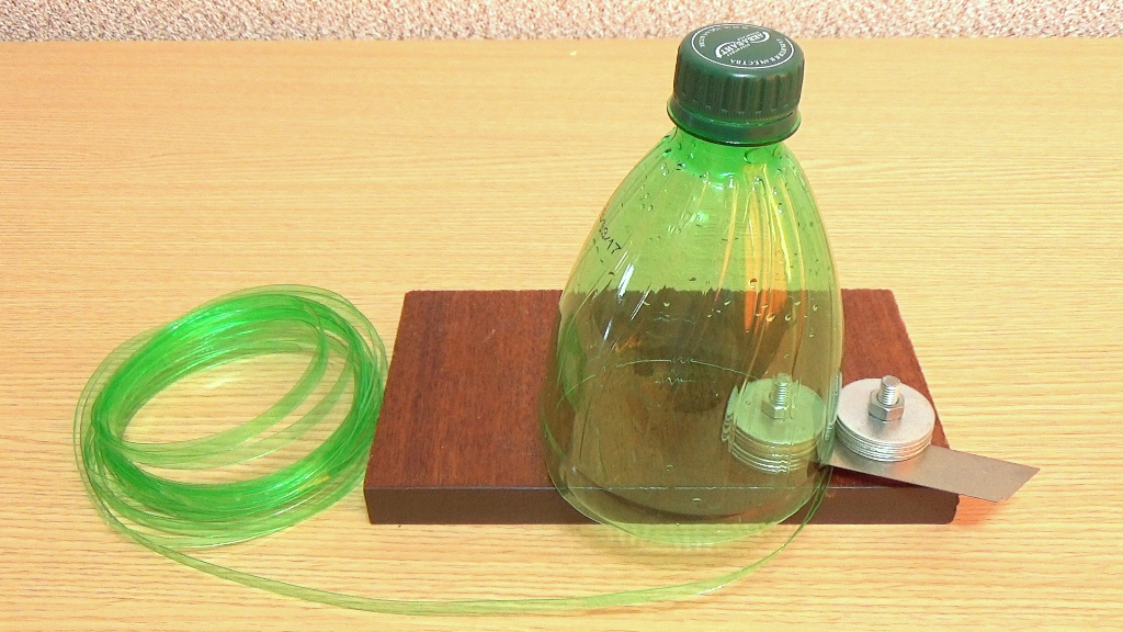 At this point the product is ready and you can start cutting. To do this, remove the bottom of the plastic container and make a small incision. Then the beginning of the tape is passed under a knife, the bottle is pressed against the plywood and pulled through, obtaining a neat and very durable plastic tape.