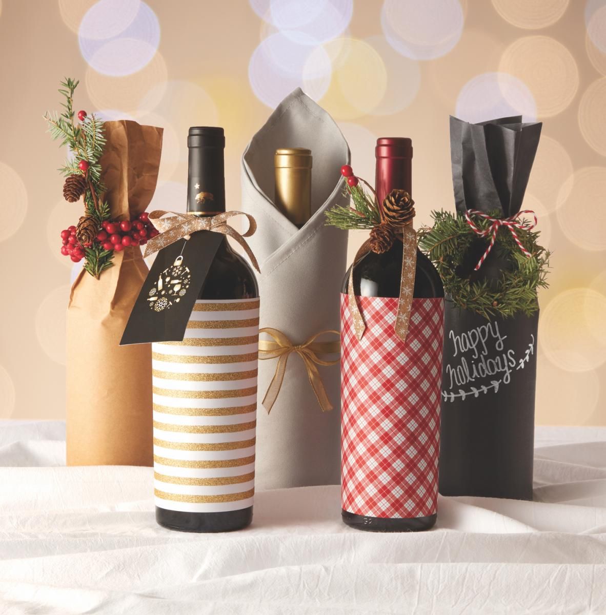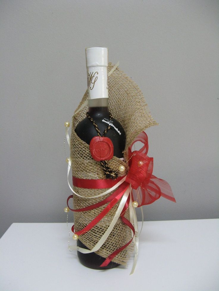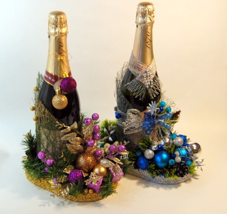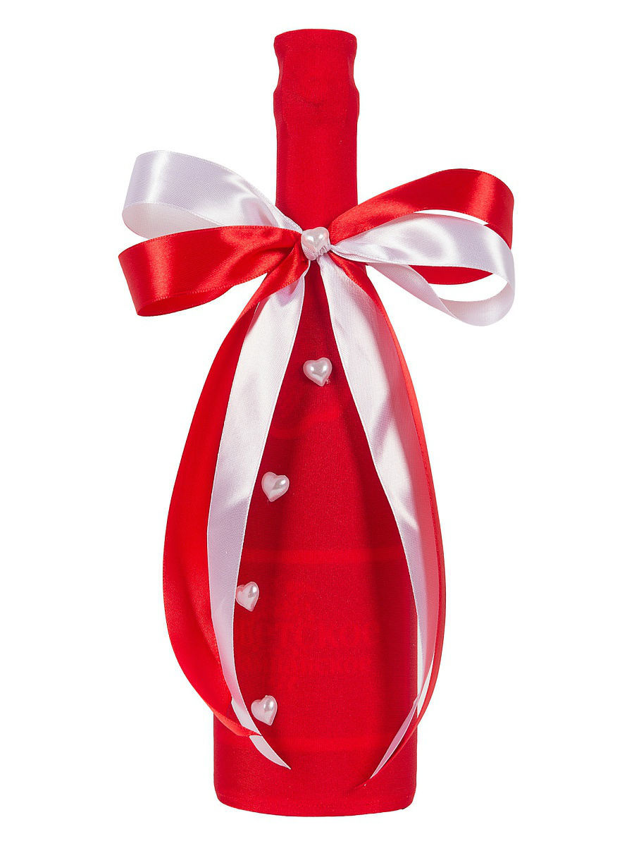 Alcoholic drinks are often chosen as gifts for various holidays. A woman will be pleased to receive a bottle of champagne or her favorite wine, decorated with an ornament made of beads. Similarly, decoration with multi-colored embroidery threads is allowed.