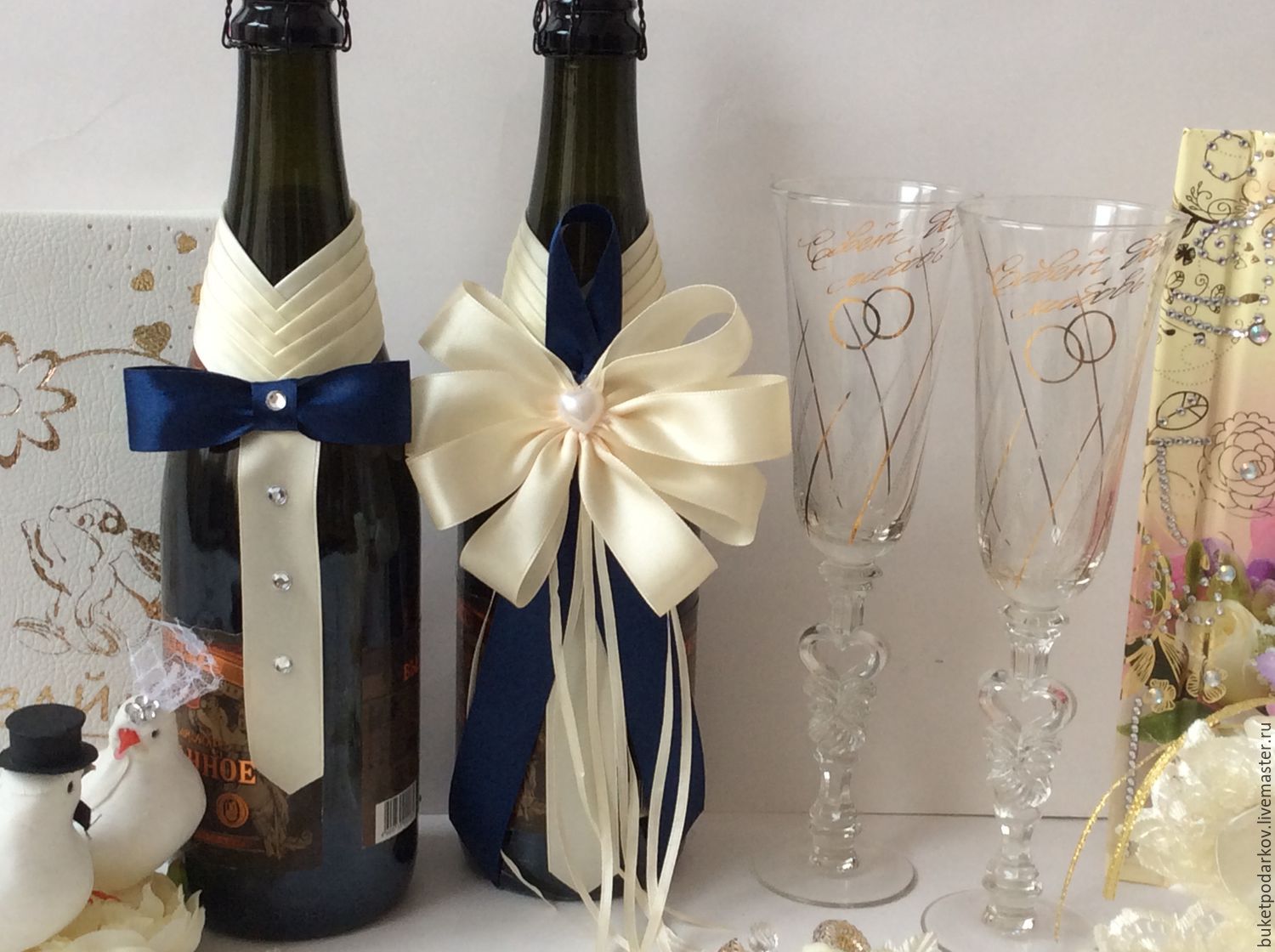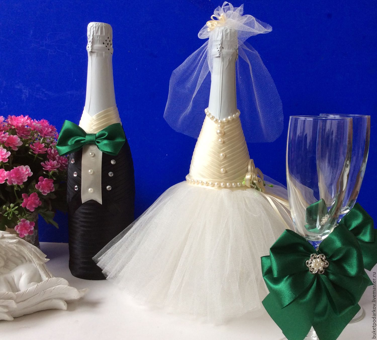 Bottles of champagne are prepared for the celebration of joining the family. Usually they are placed on the newlyweds’ table. Often the bride, who shows creative thinking, is engaged in needlework.