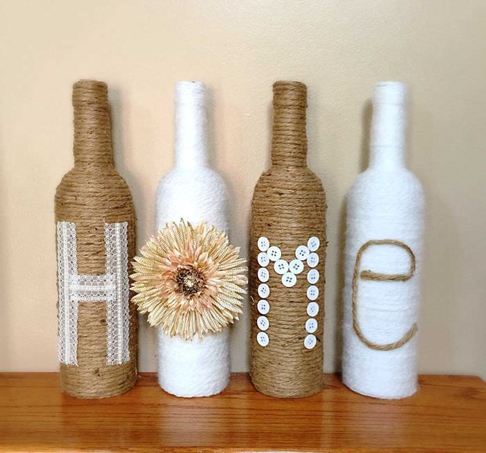 A fashionable trend today is decorating with rope. For beginners in needlework, it is enough to tightly wrap the twine around the bottle from the neck to the bottom or decorate only part of the container this way. Artificial stones, openwork ribbons or marine-style elements are glued on top.