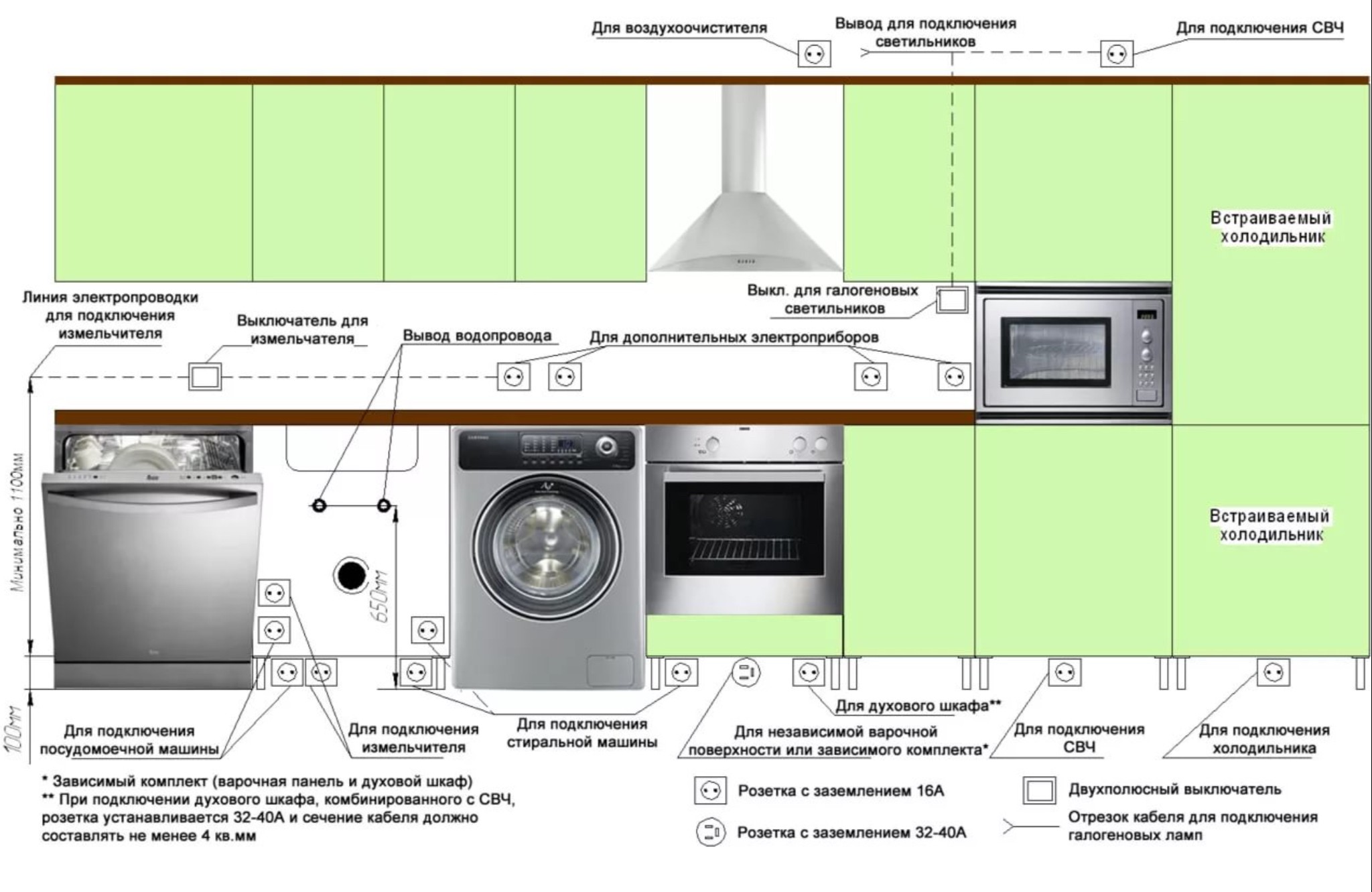 Power sources for the hob and oven should be located in the kitchen basement. For a dishwasher, it is better to place them in the base to the left or right of it. For the chopper - in the block in the central part of the kitchen.