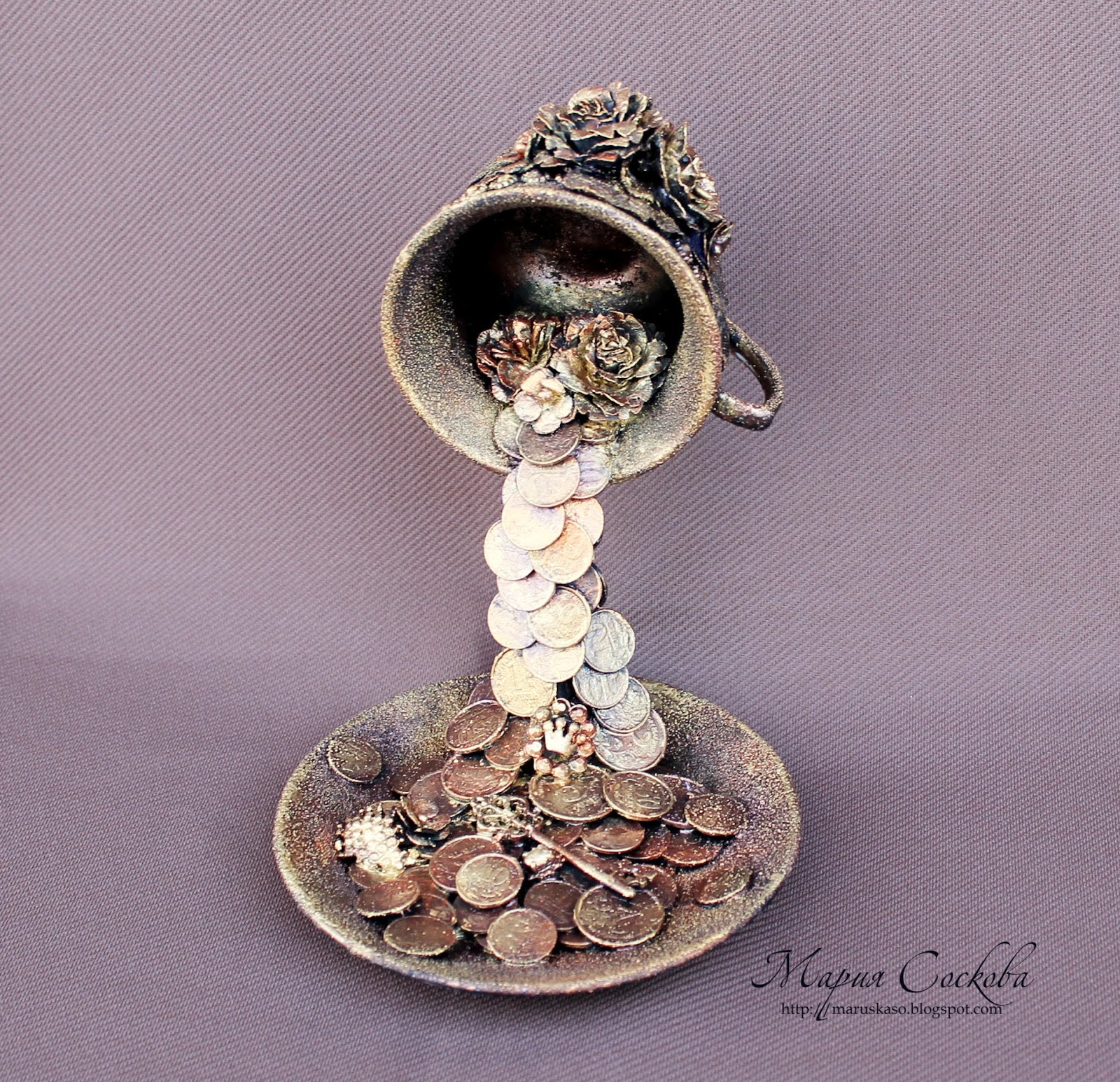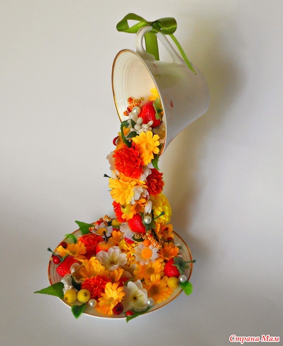 It is very easy to create a beautiful gift or decoration with your own hands. You will need a small set of tools, the necessary materials and the decor you like. They make it soaring cup with flowers, sweets, shells or coffee beans.