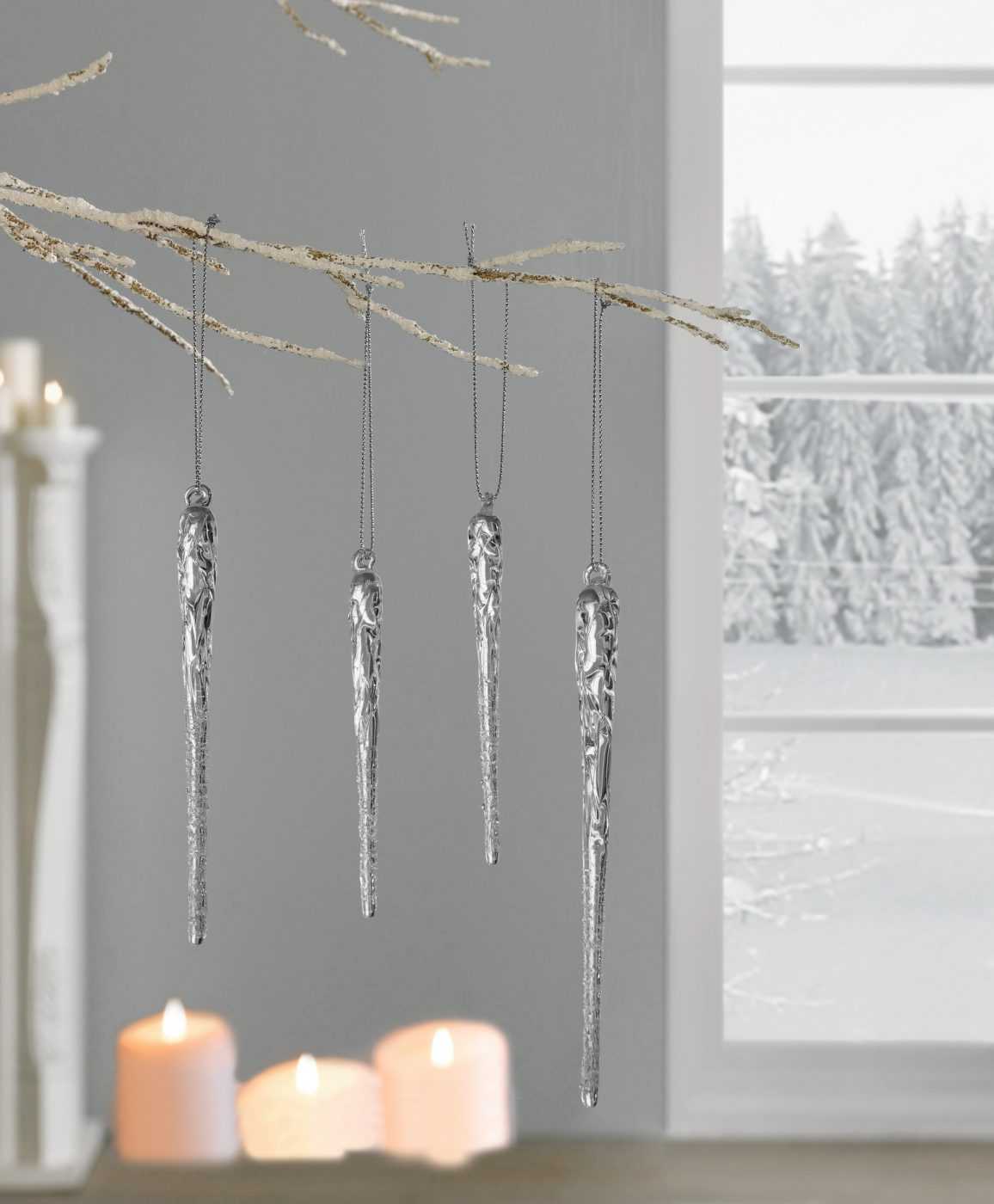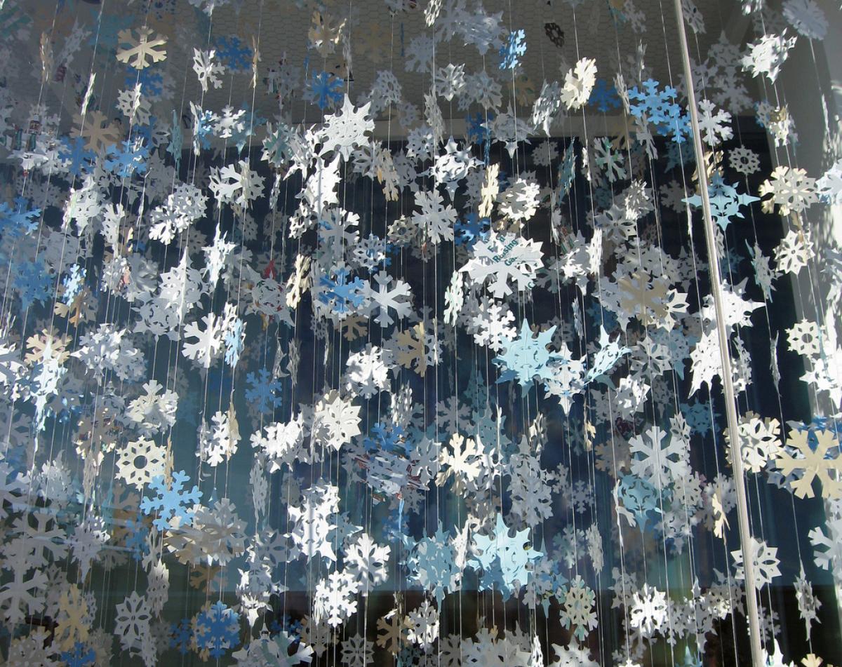 Another unusual and original option is a garland. But creating it will take a lot of time and the foil is a little denser. Just cutting out snowflakes is a difficult, monotonous and sometimes tedious task. But in the end the decor looks very nice. Then small snowflakes need to be hung on the base. In this case, you will need a strong thread and some kind of strong strip in order to then fasten it all into a single structure.