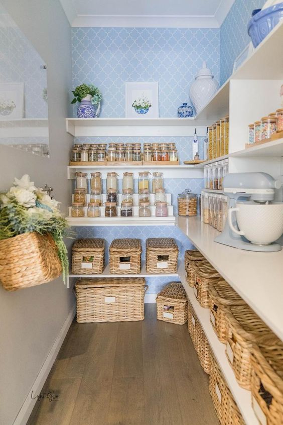 And in this small pantry, everything is always visible thanks to open shelves and glass storage jars. And the use of natural wood and calm shades makes the room cozy, with a warm atmosphere.