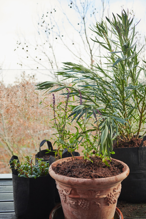 The idea was simple: the pots were arranged so that one could enjoy long-term flowering throughout the warm season. Thus, plants were selected that tolerated partial shade well and thrived in the sun. They displayed roses, lavender, rosemary, clematis, cypress, bindweed, jasmine, bluebells, verbena, wisteria, and for shade - hydrangea, geranium, sedge and some others.