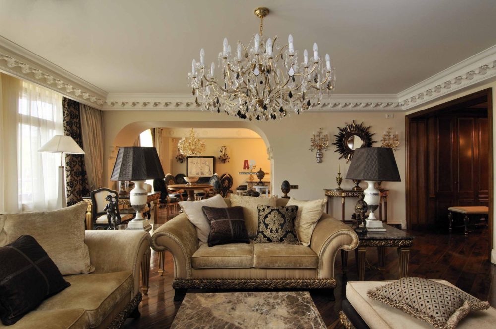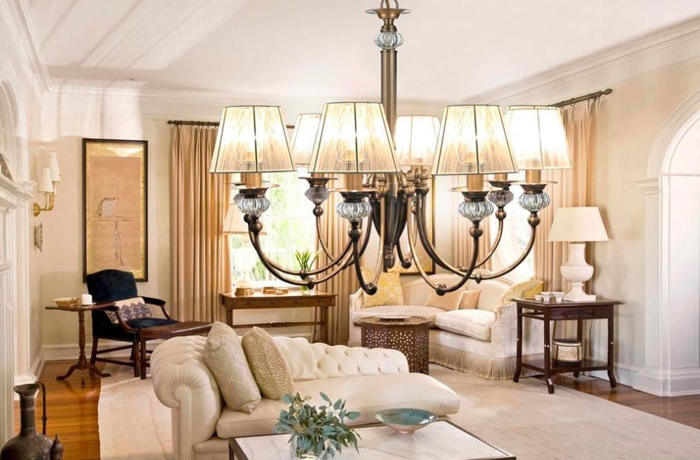 - In the living room, massive pendant lamps with several levels are traditionally installed.