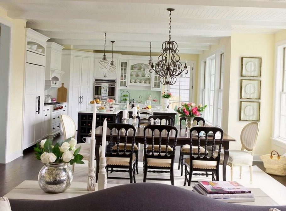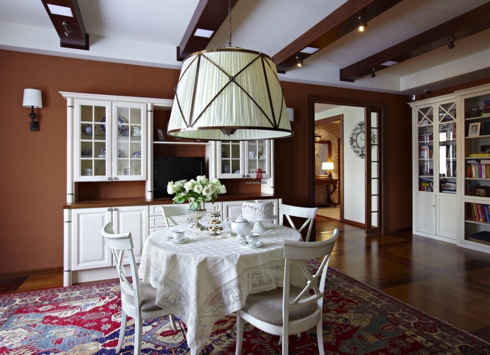 - There should be at least 2-2.3 meters from the bottom of the hanging chandelier to the floor. The exception is design projects with large lamps in the center of the composition and lampshades above the dining table.