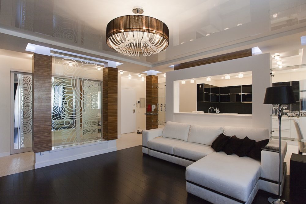 - Traditionally, there is one chandelier per room. But there are exceptions to this rule: if the room is divided into several functional zones, each can have its own light source. The main thing is not to forget - the smaller the room, the less pretentious these sources should be (in a small room, instead of a second chandelier, you can install floor lamps and sconces).