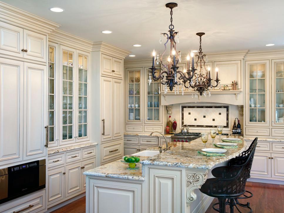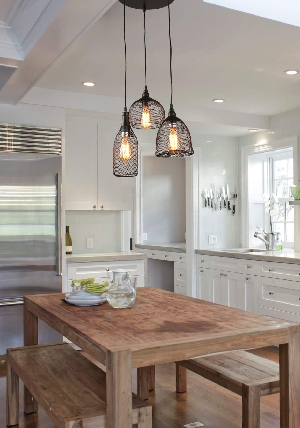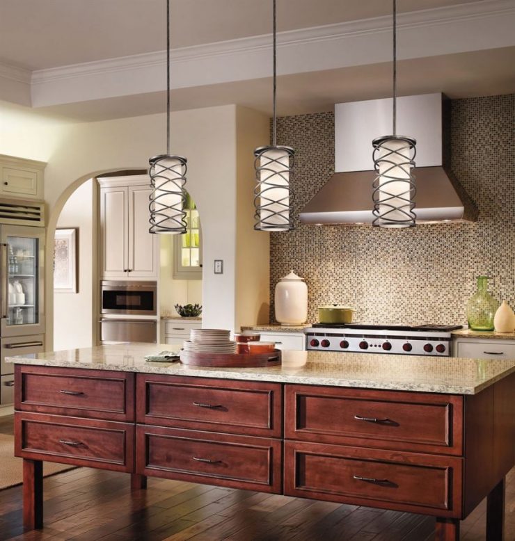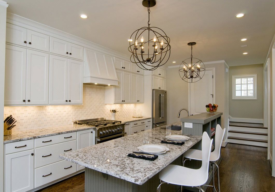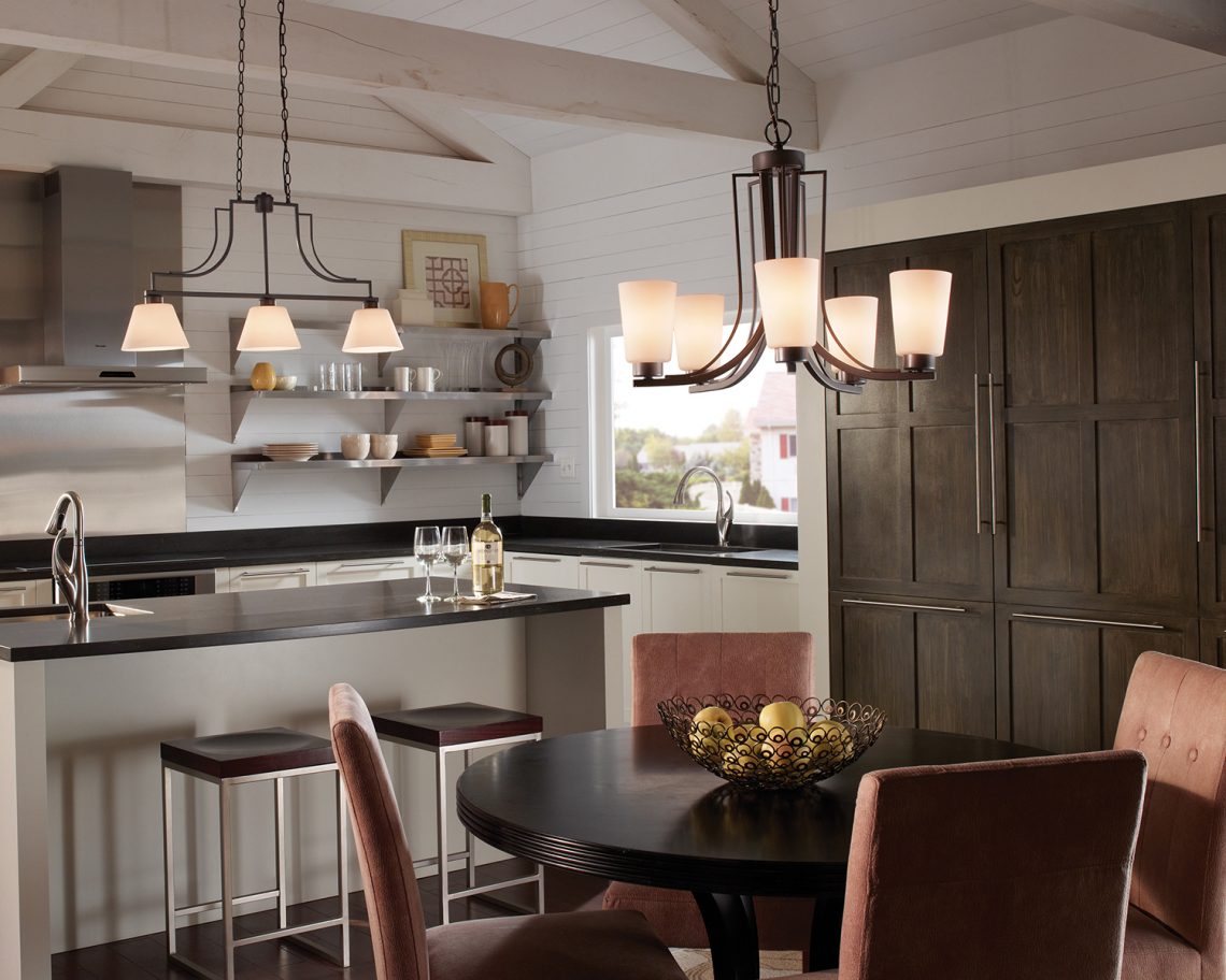 Advice! If a peninsula or island is installed in the kitchen, then the chandelier is placed above it. For the rest of the space, local lighting is suitable. In this case, the product is hung so that it is at least 70 cm above the tabletop.
