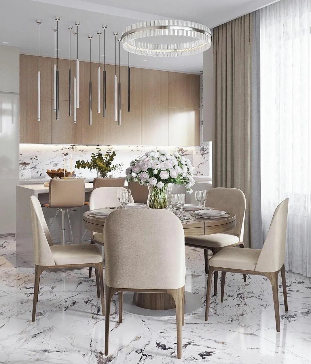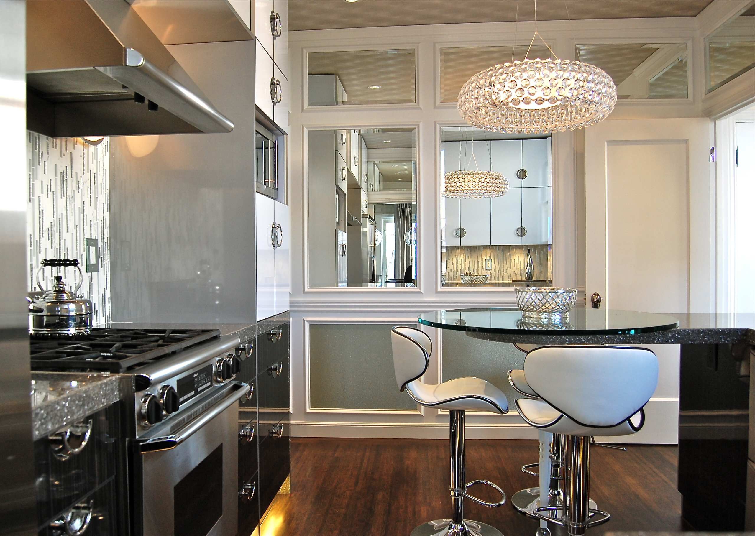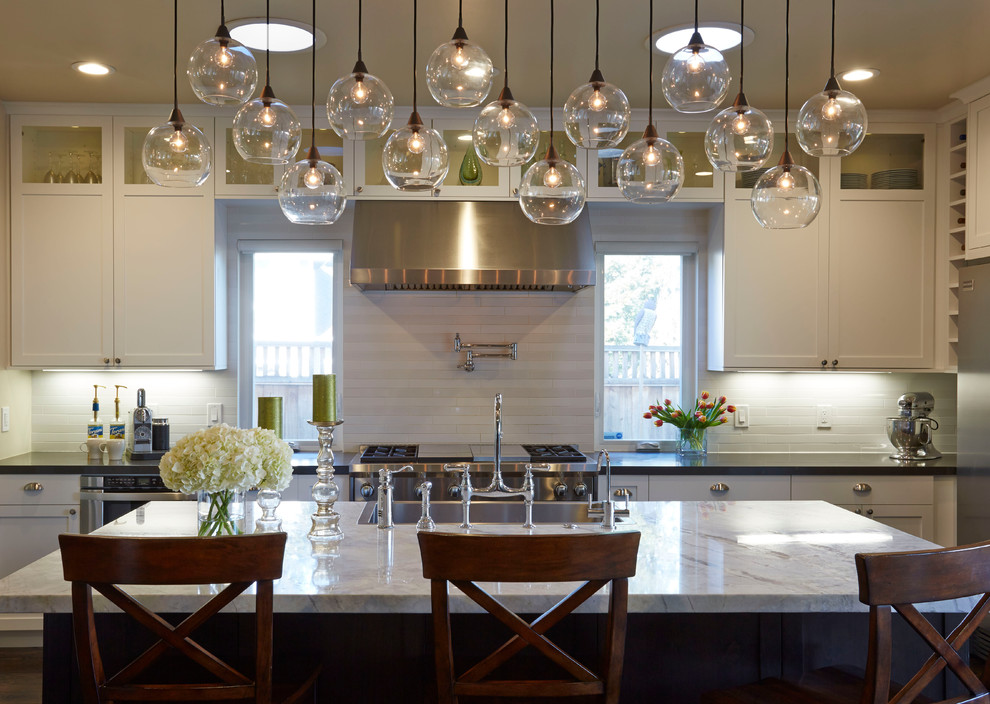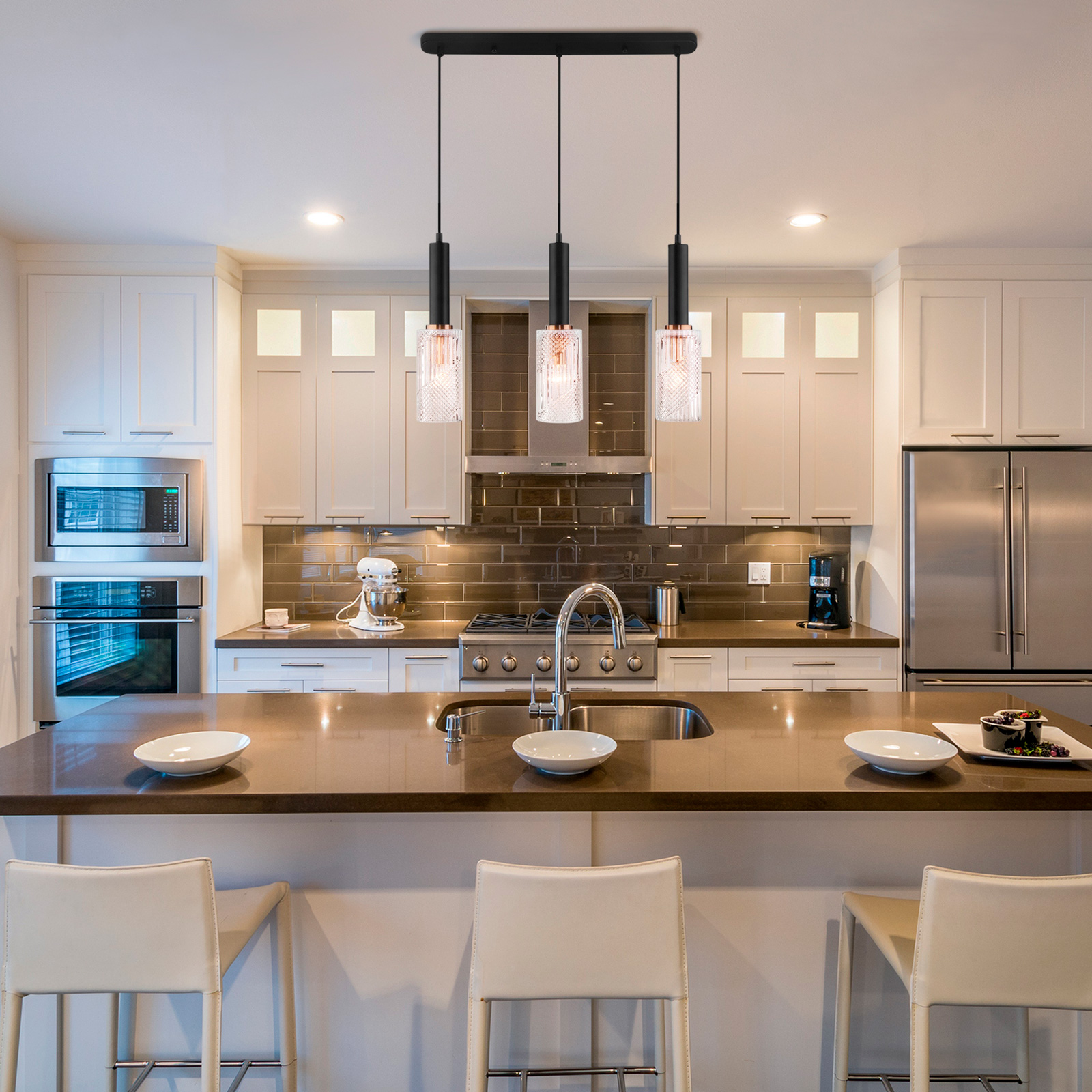 Advice! If a peninsula or island is installed in the kitchen, then the chandelier is placed above it. For the rest of the space, local lighting is suitable. In this case, the product is hung so that it is at least 70 cm above the tabletop.