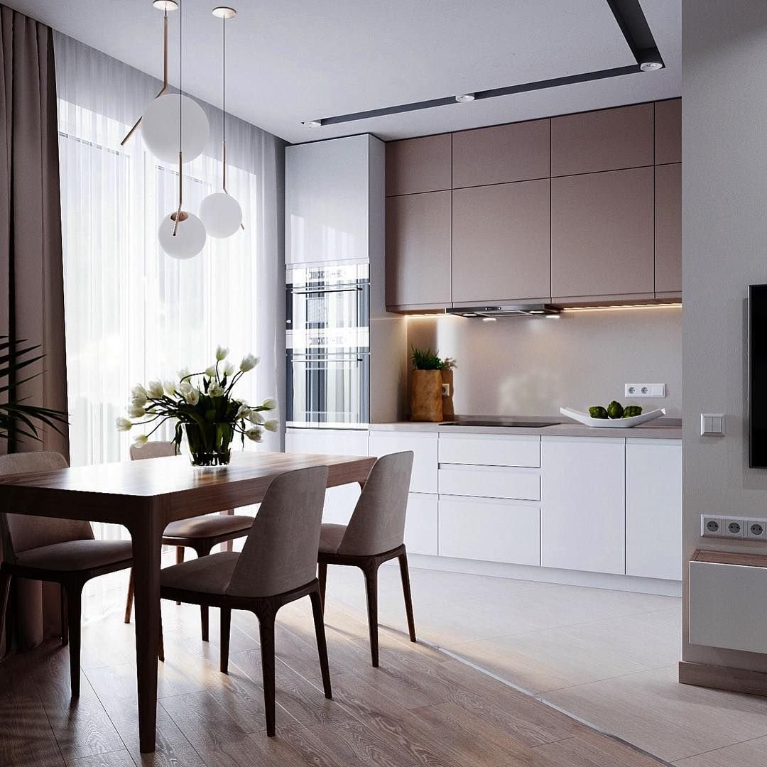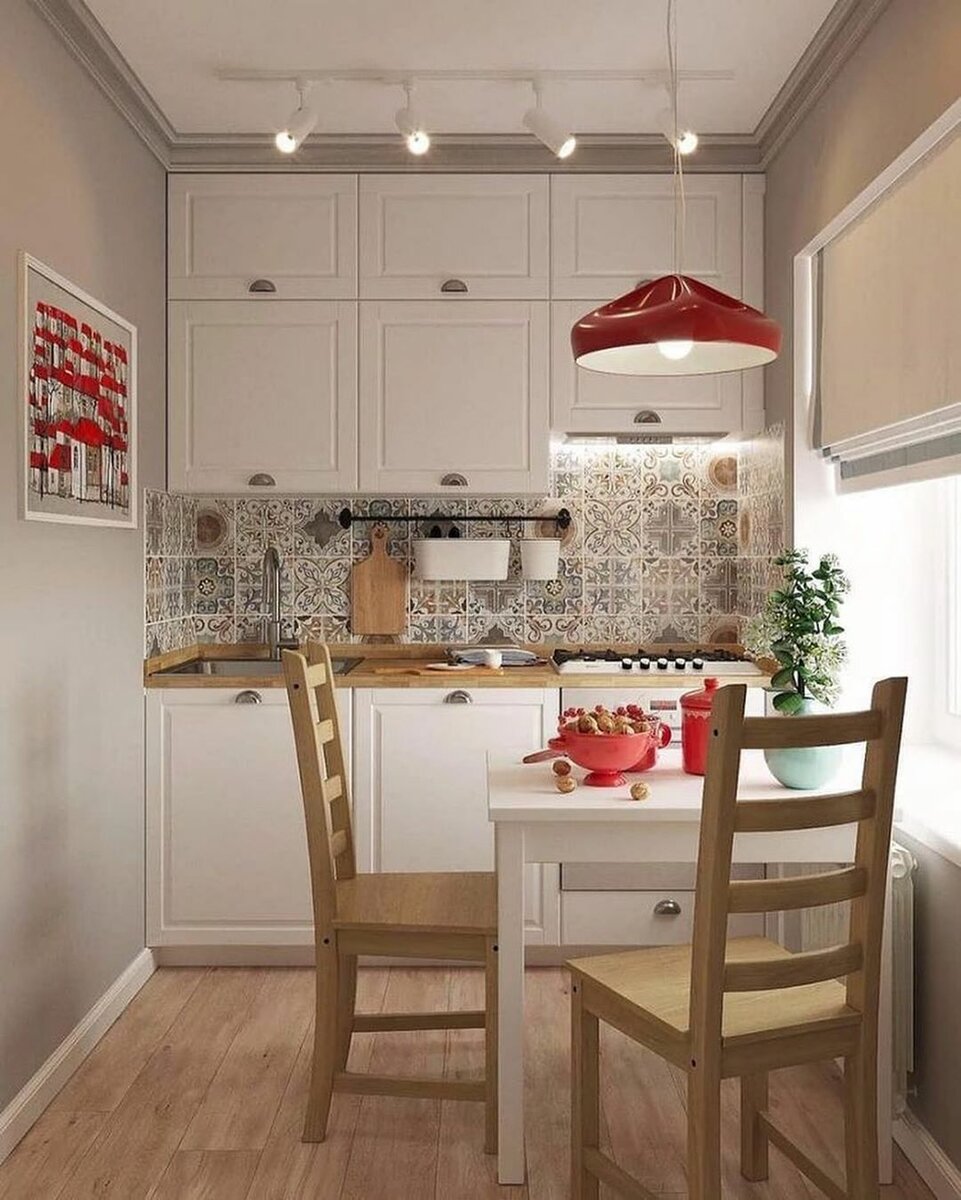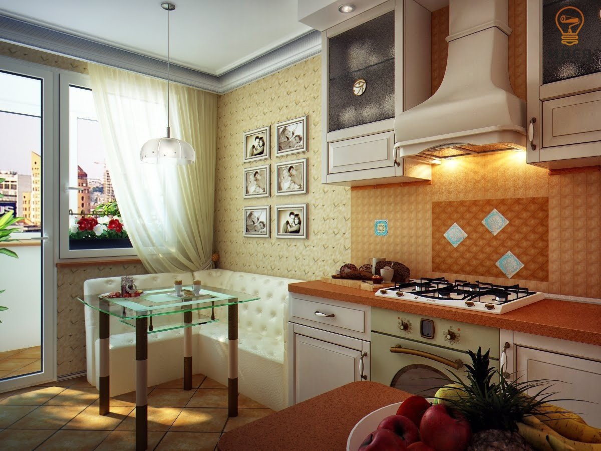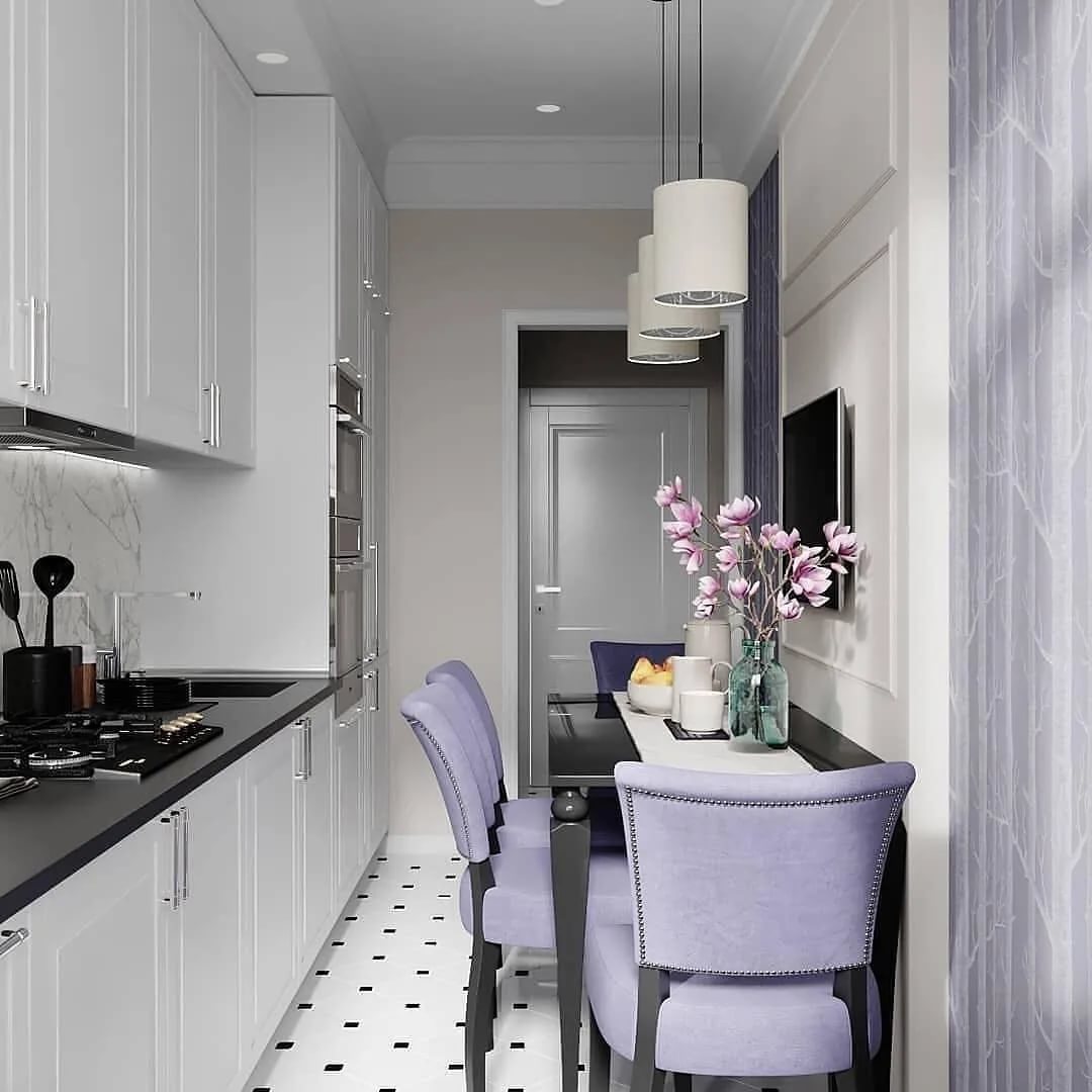 The main problem is insufficient space. And a chandelier can take away extra square meters, making the room even more compact. It is recommended to use transparent platforms. They create the effect of dissolving in the air and are barely noticeable. Lighting is suitable for the work area. For the dining area, it is preferable to choose a small lamp.