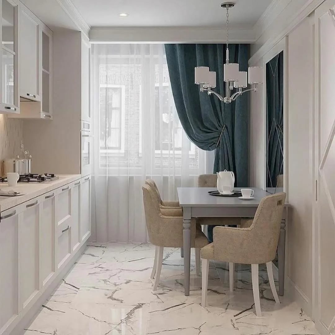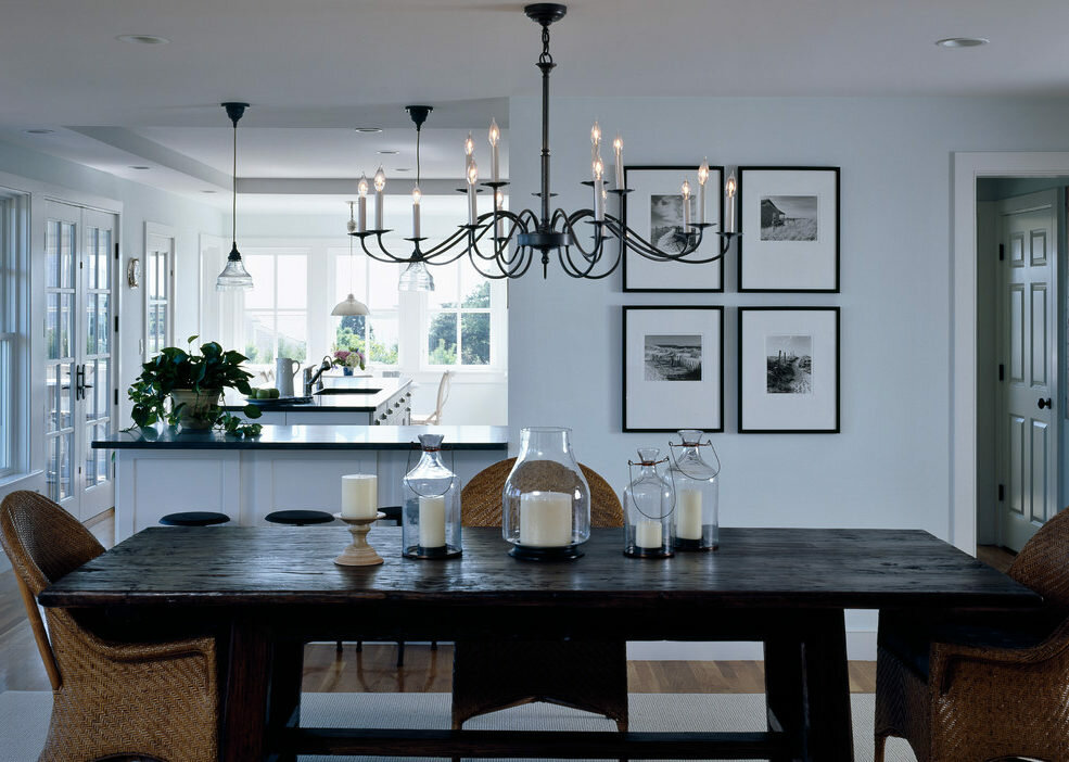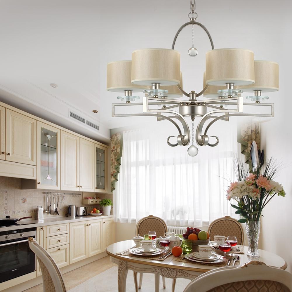 The size of the room and its shape will influence the choice of chandelier. If the room is narrow, then placing the lighting fixture in the middle will result in darkness in the corners. For such a room, it is more rational to use paired light sources.For a large kitchen, one chandelier may not be enough.
