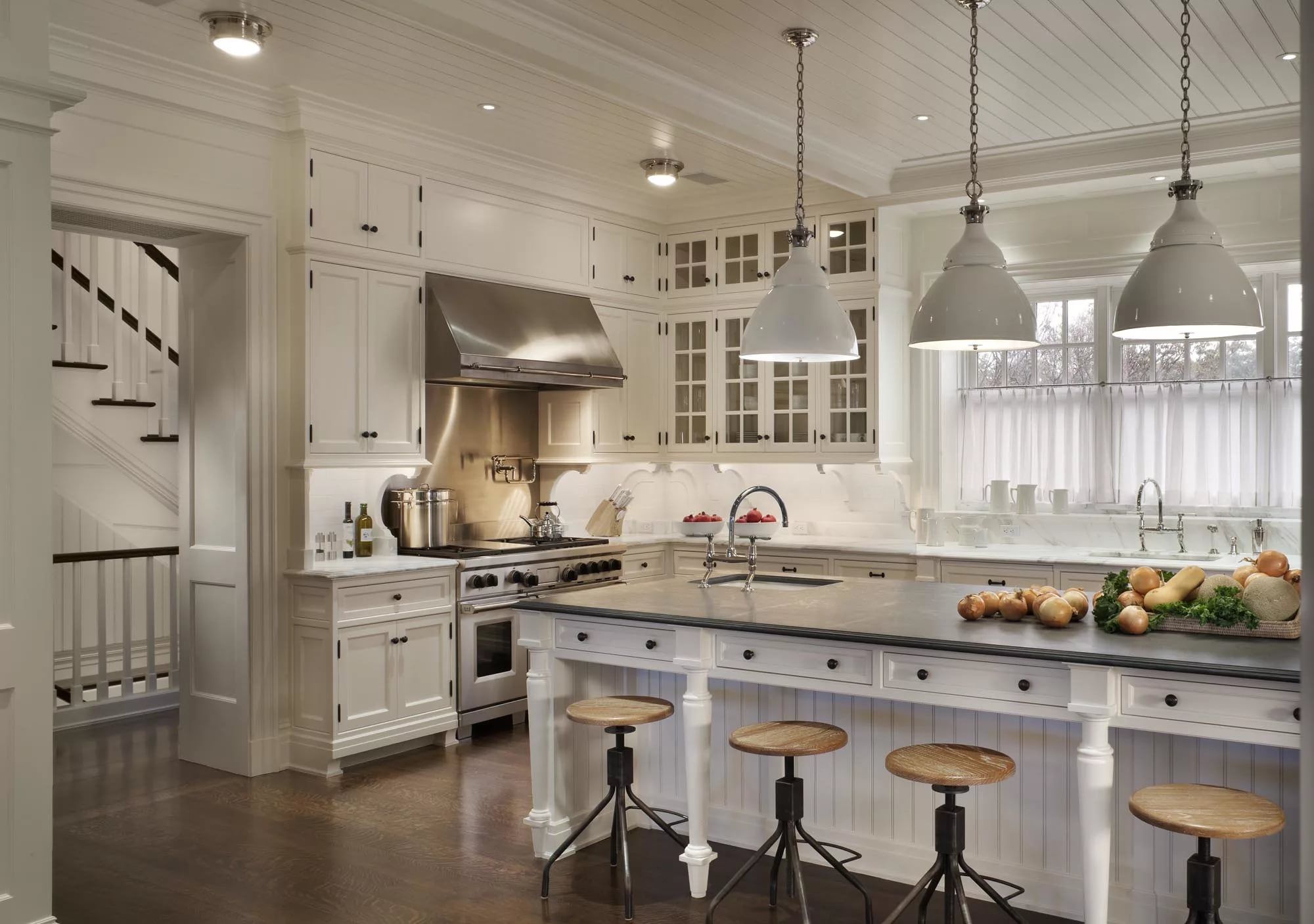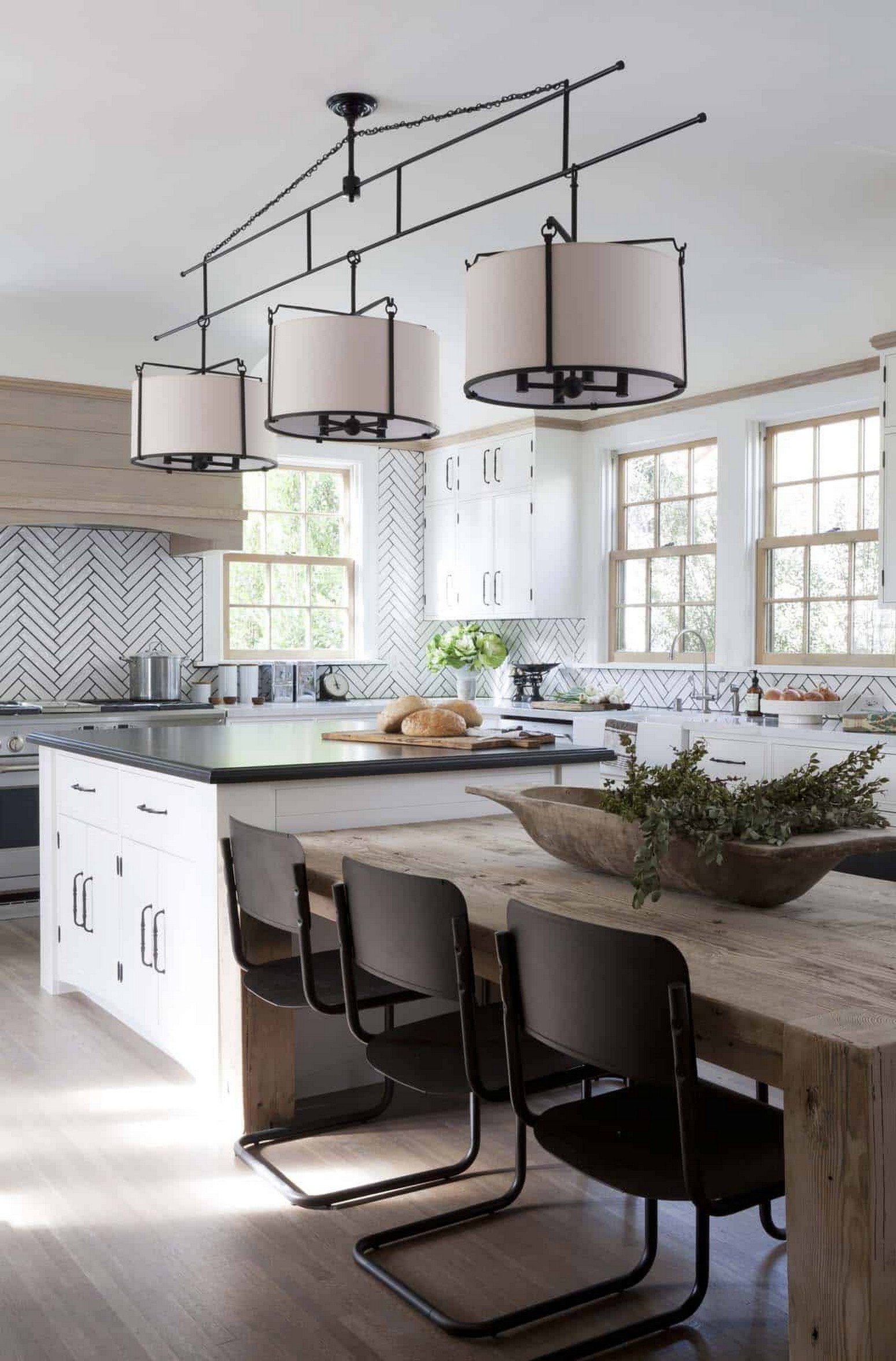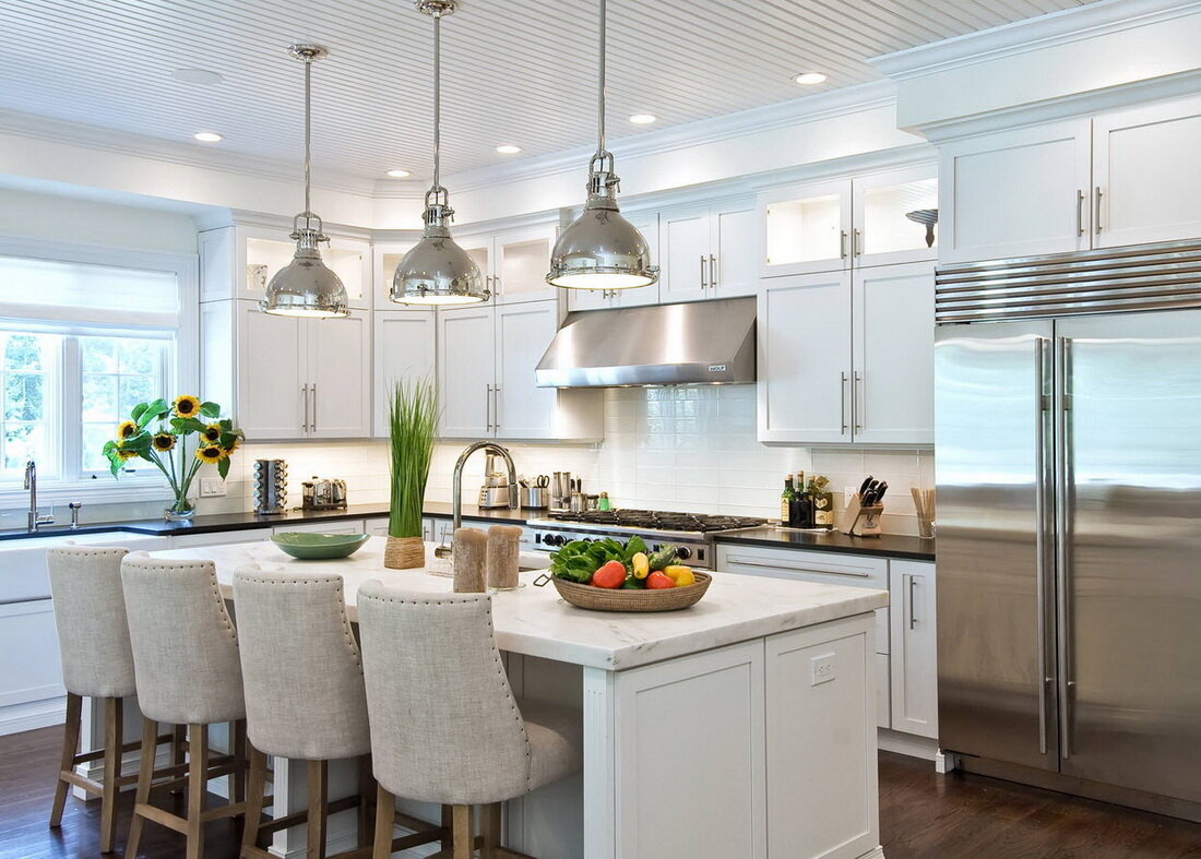 The main lighting fixture should be in the middle. But this only applies to compact kitchens. If the room is spacious, it is conditionally or practically divided into several main zones, including the place where they cook and the island where they eat. Therefore, you will need several light sources for each selected segment. You can use paired devices.